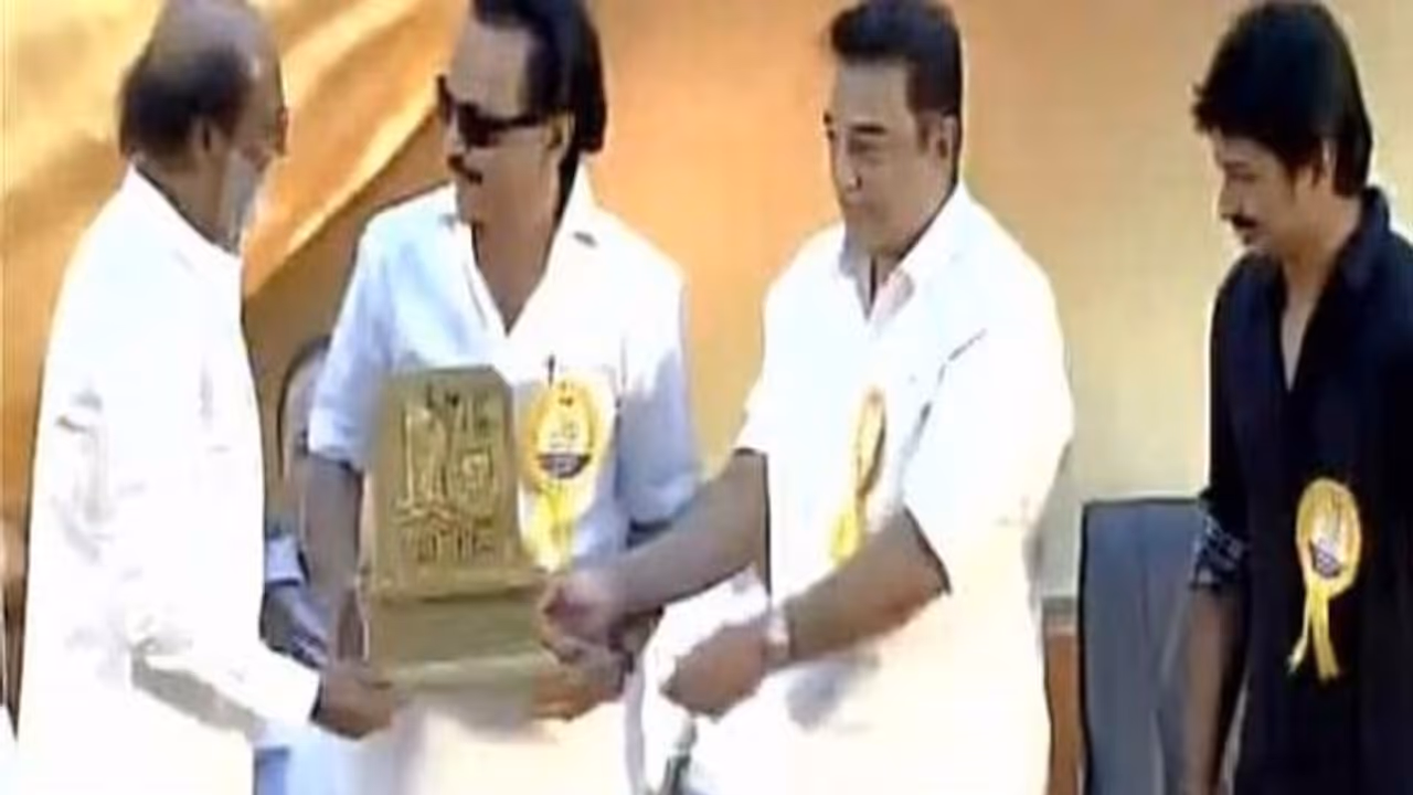 இந்த விழாவில் பார்வையாளராக பங்கேற்ற நடிகர் ரஜினிகாந்துக்கு ஸ்டாலின் பொன்னாடை போர்த்தி நினைவுப் பரிசு வழங்கினார்.