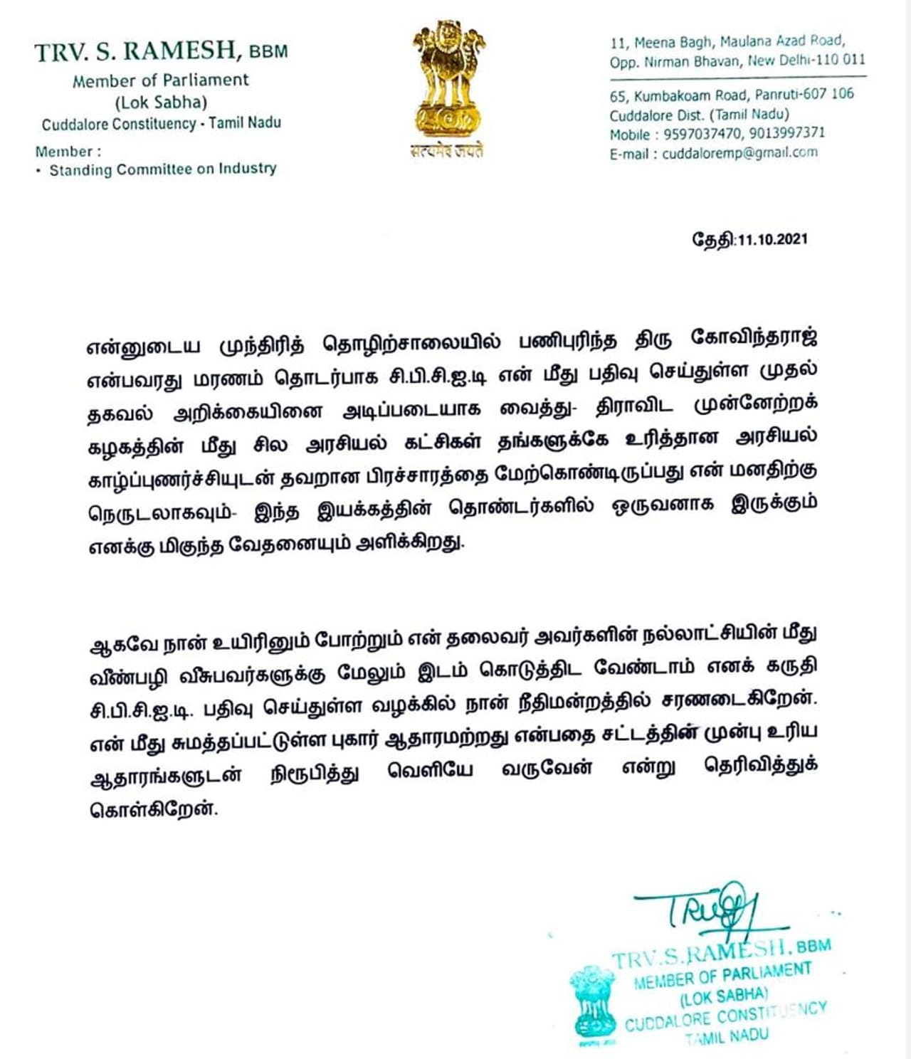 என்னுடைய முந்திரி தொழிற்சாலையில் பணிபுரிந்த திரு. கோவிந்தராஜ் என்பவர் மரணம் தொடர்பாக, சிபிசிஐடி என் மீது பதிவு செய்துள்ள முதல் தகவல் அறிக்கையை அடிப்படையாக வைத்து, திராவிட முன்னேற்றக் கழகத்தின் மீது சில அரசியல் கட்சிகள் தங்களுக்கே உரித்தான அரசியல் காழ்ப்புணர்ச்சியுடன் தவறான பிரச்சாரத்தை மேற்கொண்டு இருப்பது என் மனதுக்கு நெருடலாகவும், இந்த இயக்கத்தின் தொண்டர்களில் ஒருவனாக இருக்கும் எனக்கு மிகுந்த வேதனையையும் அளிக்கிறது.