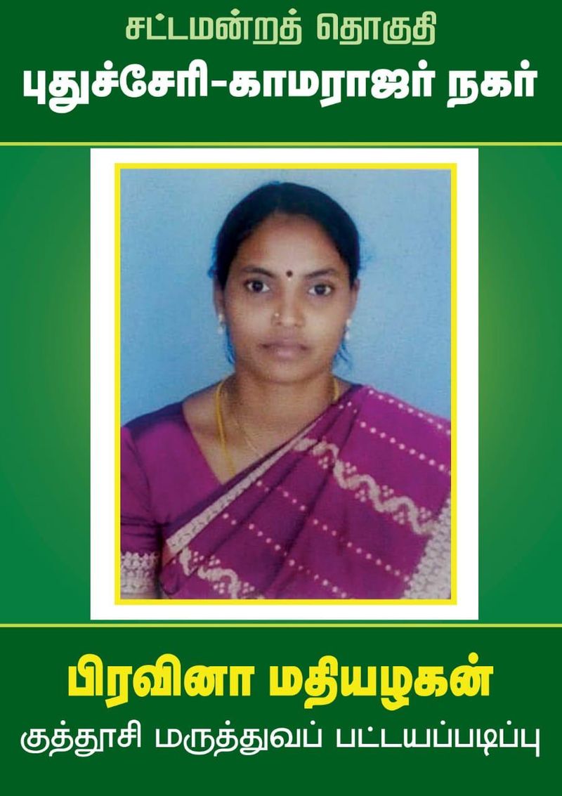 இதே போல் புதுச்சேரி மாநிலம் காமராஜர் நகரில் பிரவினா மதியழகன் நாம் தமிழர் சார்பில் போட்டிடுகிறார். இவர் அக்குபஞ்சர் பட்டயப் படிப்பு படித்துள்ளார்.