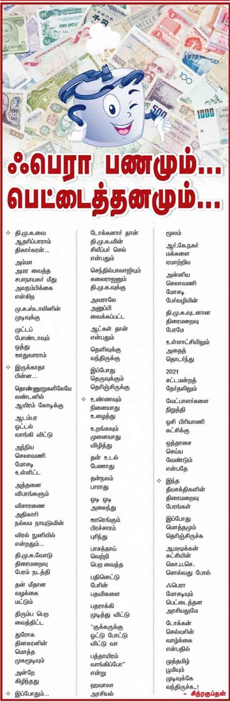 இப்போது மொத்தமும் தெரிஞ்சிருச்சு இருக்கு அமமூக்கனின் கட்சி கொ.ப.செ சொல்வது போல, ஃ பெரா மோசடியும் பெட்டைத்தன, அரசியலும் டோக்கன் செல்வரின் வாழ்க்கை என்பதில் முத்தமிழ் பூமியும் முடிவுக்கே வந்துருச்சு... என இவ்வாறு கிழித்து கடாசியுள்ளனர்.