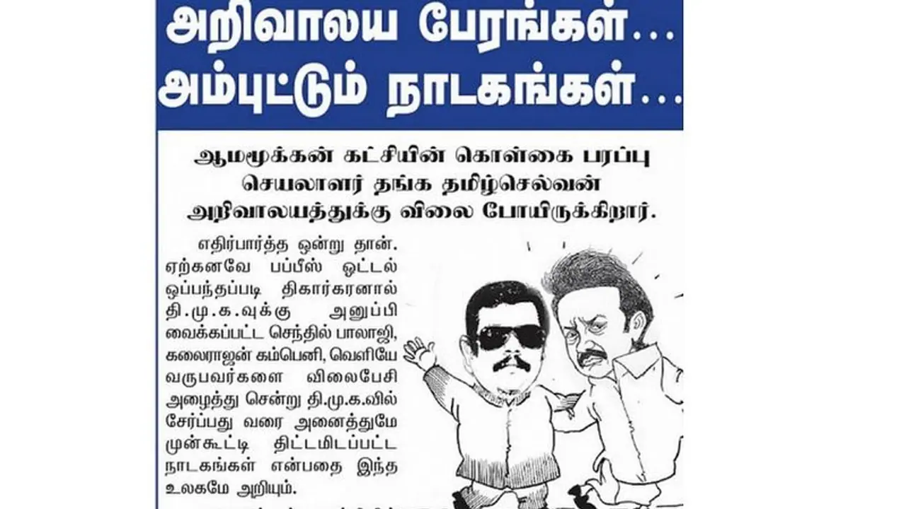 அறிவாலய பேரங்கள்… அம்புட்டும் நாடகங்கள் என்ற தலைப்பில் அதிமுகவின் அதிகாரபூர்வ நாளேட்டில் தங்க தமிழ்ச்செல்வனை பற்றி எழுதியுள்ள தலையங்கத்தில், ஆமமூக்கன் கட்சியின் கொள்கை பரப்பு செயலாளர் தங்க தமிழ்செல்வன் அறிவாலயத்துக்கு விலை போயிருக்கிறார்.