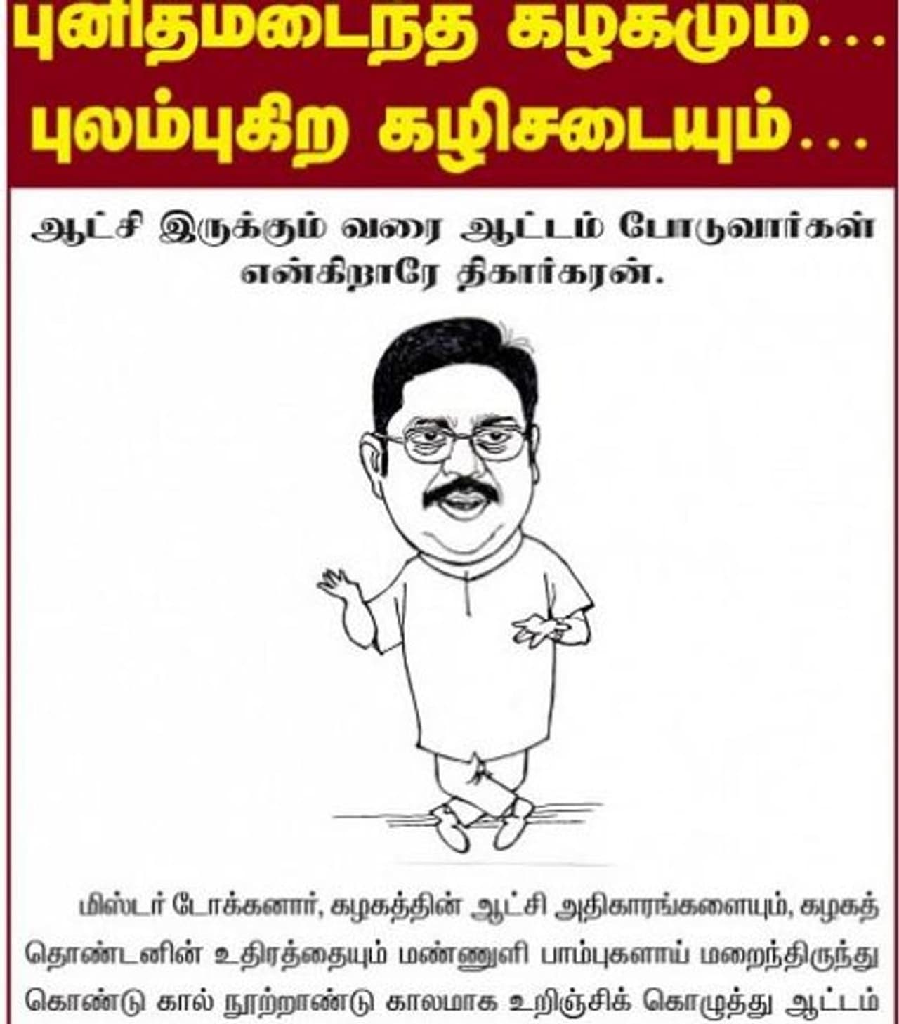 ஆனால், இன்றைக்கும் மாஃபியாக்கள் இல்லாத இயக்கமாக மக்கள் திலகம் கண்ட அனைத்திந்திய அண்ணா திராவிட முன்னேற்ற கழகம் தீட்டு கழிக்கப்பட்ட புனிதமாக திகழ்கிறது. அம்மாவின் மறைவு வரை பாண்டிச்சேரி பக்கமா பதுங்கு குழிகளில் ஒளிந்து கிடந்த பேர்வழி அண்ணா திமுகவை அபகரிக்க முடியவில்லையே என்கிற எரிச்சலும், நமைச்சலிலும் கழகத்தையும், கழகத்தின் ஆட்சியையும் பழிப்பது அண்டை வீட்டுக்காரிக்கு ரெட்ட புள்ள பிறந்ததுன்னு அம்மி குளவியை எடுத்து அடி வயிற்றில் அடித்துக் கொண்டாளாம் வயிற்றெரிச்சல்காரி என்னும் கதை தான் இப்படி முட்ட போண்டாவின் முனகலும் புலம்பலும்" என விமர்சனம் செய்துள்ளது.