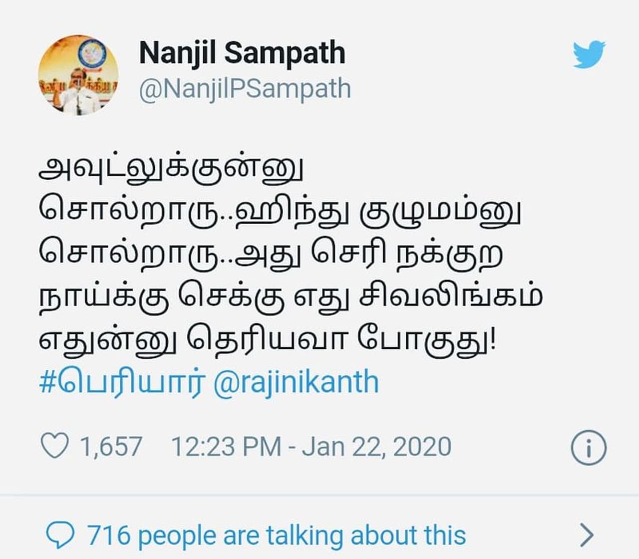 இவ்வளவு அறிவுரை சொல்லும் ரஜினி செய்தியாளர்களை சந்திப்பதற்கு முன்னர் எது எந்த பத்திரிக்கை என்ற விவரத்தை தெரிந்து வைத்திருக்க வேண்டாமா என பலர் ரஜினியை கிண்டலடித்து வருகின்றனர் . இந்நிலையில் இலக்கியச் சொற்பொழிவாளரும் அரசியல் பேச்சாளருமான நாஞ்சில் சம்பத் டுவிட் ஒன்றை வெளியிட்டுள்ளார் , அதில் அவுட்லுக்குன்னு சொல்றாரு , " இந்து குழுமம்னு சொல்றாரு அதுசரி நக்குற நாய்க்கு செக்கு எது சிவலிங்கம் எதுன்னு தெரியவா போகுது"# பெரியார் #ரஜினிகாந்த் என்று குறிப்பிட்டுள்ளார் . இந்நிலையில் நடிகர் ரஜினிகாந்தை நாயுடன் ஒப்பிட்டு பேசியதற்கு அவரது ரசிகர்கள் நாஞ்சிலுக்கு கண்டனம் தெரிவித்துள்ளனர்.