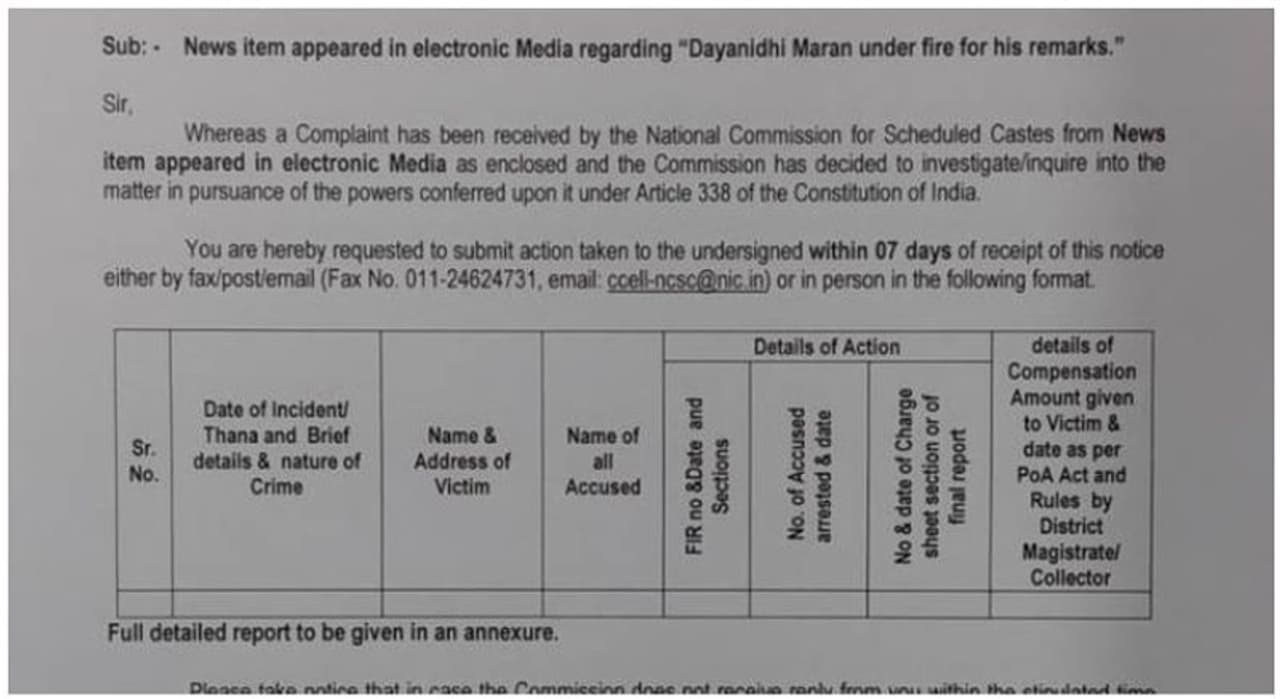திமுக தயாநிதி மாறன் ‘நாங்கள் தாழ்த்தப்பட்டவர்களா’ என்று பேசியது தொடர்பாக தேசிய எஸ்.சி. ஆணையம் தமிழக அரசிடம் விளக்கம் கோரியுள்ளது.