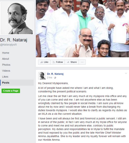 தனது முகநூலில் தனது நிலைப்பாட்டை நடராஜ் தெரிவித்துள்ளார். அதில் தனது ஒரே தலைவர் ஜெயலலிதா எனவும் அவர் வழியில் நடப்பேன் எனவும் தெரிவித்துள்ளார்.