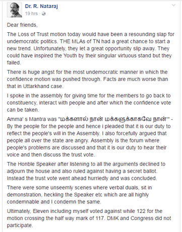 இந்நிலையில் எடப்பாடி பழனிசாமி முதலமைச்சராக தேர்வு செய்ததற்கு பின் தனது முகநூல் பக்கத்தில் சட்டசபையில் நடந்த நிகழ்வுகள் குறித்து பதிவு ஒன்றை நட்ராஜ் வெளியிட்டுள்ளார். அதில் கூறியதாவது:
