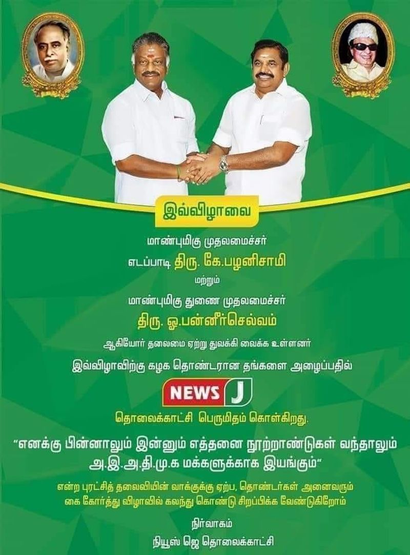 "எனக்கு பின்னாலும் இன்னும் எத்தனை நூற்றாண்டுகள் வந்தாலும் அஇஅதிமுக மக்களுக்காக இயங்கும்" என்ற புரட்சித்தலைவியின் வாக்குக்கு ஏற்ப தொண்டர்கள் அனைவரும் கை கோர்த்து விழாவில் கலந்துக் கொண்டு சிறப்பிக்க வேண்டுகிறோம் என குறிப்பிடப்பட்டு உள்ளது.