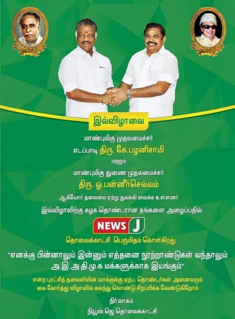 முதலமைச்சர் எடப்பாடி பழனிசாமி மற்றும் துணை முதலமைச்சர் ஓபிஎஸ் ஆகியோர் எம்.ஜி.ஆர்.. ஜெயலதா ஆகியோரின் படங்களுக்கு மலர் தூவி மரியாதை செலுத்தினர். இதைத் தொடர்பந்து நியூஸ் ஜெ தொலைக்காட்சியின் ஒளிபரப்பை அவ்கள் இருவரும் தொடங்கி வைத்தனர்.