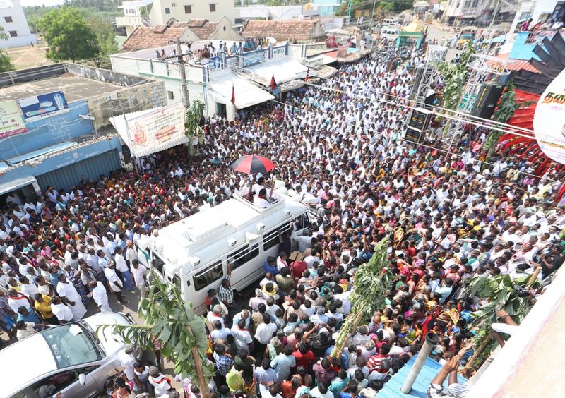 தொகுதிக்குட்பட்ட தடாகோவில், வாவிகனம், ஈசநத்தம், இந்திரா நகர், தென்னிலை, பரமத்தி, சின்னதாராபுரம் ஆகிய இடங்களில் திறந்த வேனில் நின்றபடி தி.மு.க. வேட்பாளருக்கு வாக்கு கேட்டு பேசினார்.
