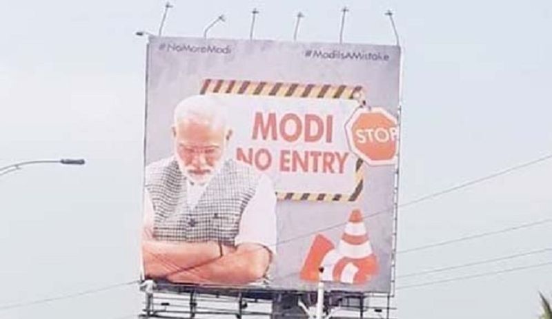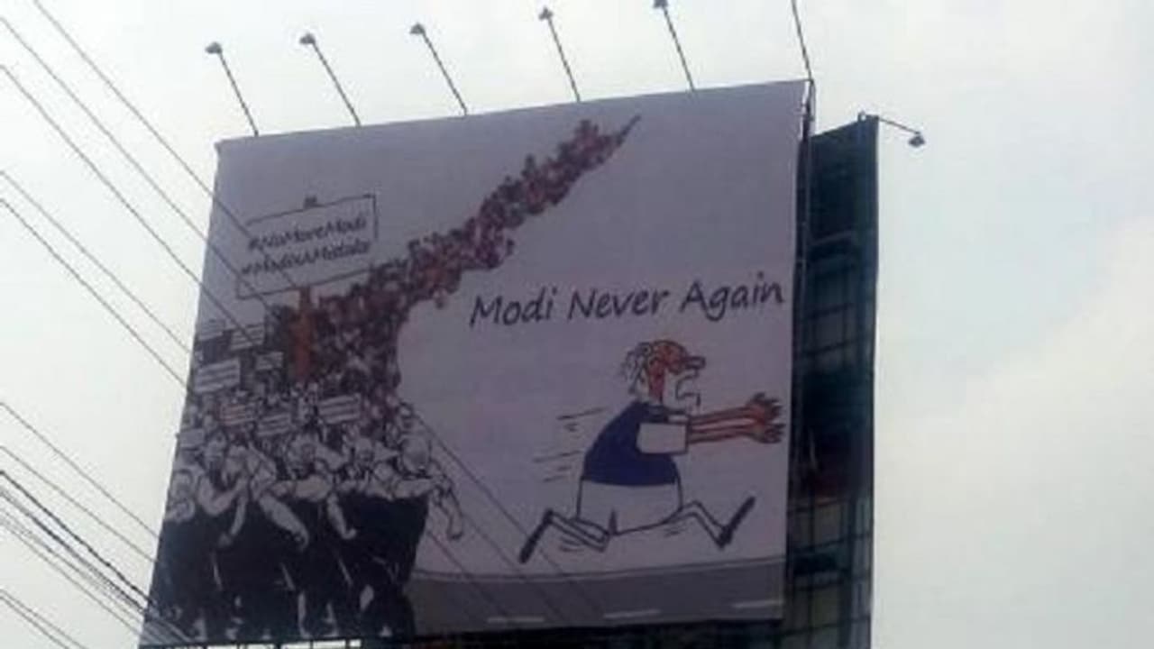 அவற்றில் பொதுமக்கள் புஜங்களை உயர்த்திபடி விரட்டுவதும், பிரதமர் ஓடுவது போன்றும் அதன்மேல் ஆங்கிலத்தில் மோடி மீண்டும் ஆட்சிக்கு வரமுடியாது என்பன போன்றும் வாசகங்கள் எழுதப்பட்டு உள்ளன.