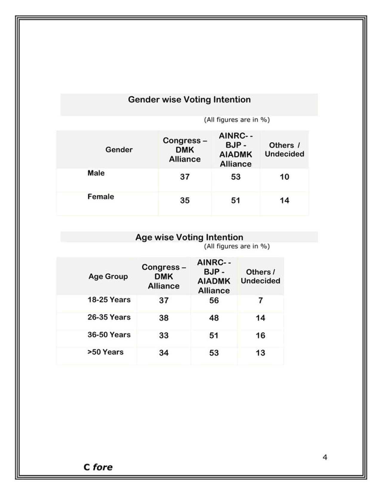 அதேபோல் அம்மாநிலத்தில் இடம்பெற்றுள்ள 18 வயது முதல் 25 வயதுக்குட்பட்ட இளைஞர்களில் 56% பேர் அதிமுக-பாஜக-என்ஆர் காங்கிரஸ் கூட்டணிக்கு வாக்களிப்பர் என தெரியவந்துள்ளது. அவர்கள் 37 சதவீதம் பேர் மட்டுமே திமுக-காங்கிரஸ் கூட்டணிக்கு வாக்களிப்பர் என தெரிவிக்கப்பட்டுள்ளது. அதேபோல் 26 வயது முதல் 35 வயதுக்குட்பட்டவர்களில் 38% பேர் திமுக காங்கிரஸ் கூட்டணிக்கு வாக்களிப்பர் எனவும், அது அவர்களில் 48% பேர் அதிமுக-பாஜக-என்ஆர் காங்கிரஸ் கூட்டணிக்கு வாக்களிப்பர் எனவும் தெரியவந்துள்ளது. அதேபோல் 36 வயது முதல் 50 வயதுக்குட்பட்ட 33 சதவீதம் பேர் திமுக- காங்கிரஸ் கூட்டணிக்கு வாக்களிப்பர் என்றும், அதே அவர்களில் 51 சதவீதம் பேர் அதிமுக-பாஜக-என்ஆர் காங்கிரஸ் கூட்டணிக்கு வாக்களிப்பர் எனவும் தெரியவந்துள்ளது.