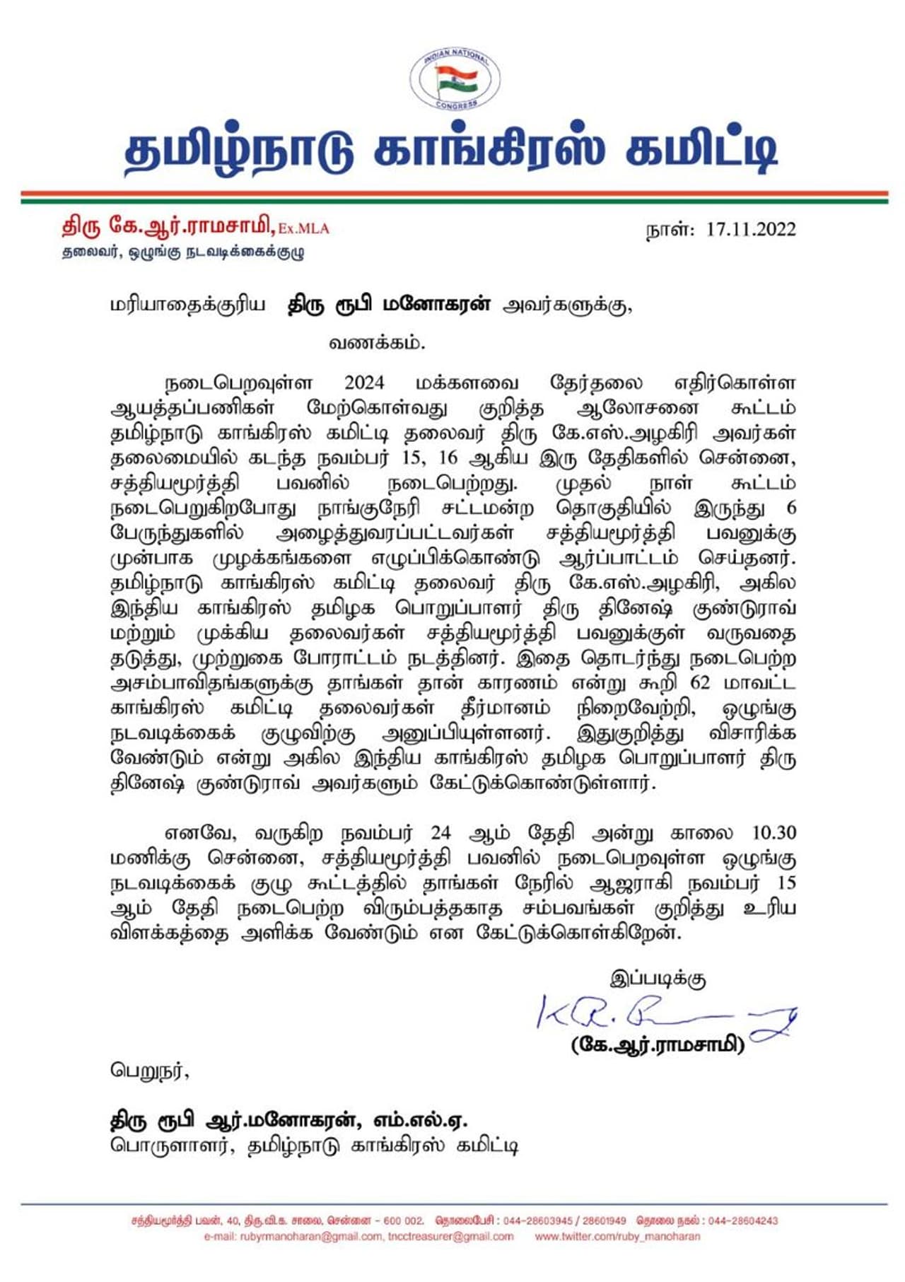 இதனையடுத்து ஒழுங்கு நடவடிக்கைக்குழு தலைவர் கே.ஆர்.ராமசாமி, அவர்கள் சட்டமன்ற உறுப்பினர் ரூபி மனோகரனுக்கு எழுதியுள்ள கடிதத்தில், நடைபெறவுள்ள 2024 மக்களவை தேர்தலை எதிர்கொள்ள ஆயத்தப்பணிகள் மேற்கொள்வது குறித்த ஆலோசனை கூட்டம் தமிழ்நாடு காங்கிரஸ் கமிட்டி தலைவர் திரு கே.எஸ்.அழகிரி அவர்கள் தலைமையில் கடந்த நவம்பர் 15, 16 ஆகிய இரு தேதிகளில் சென்னை, சத்தியமூர்த்தி பவனில் நடைபெற்றது. முதல் நாள் கூட்டம் நடைபெறுகிறபோது நாங்குநேரி சட்டமன்ற தொகுதியில் இருந்து 6 பேருந்துகளில் அழைத்துவரப்பட்டவர்கள் சத்தியமூர்த்தி பவனுக்கு முன்பாக முழக்கங்களை எழுப்பிக்கொண்டு ஆர்ப்பாட்டம் செய்தனர். தமிழ்நாடு காங்கிரஸ் கமிட்டி தலைவர் திரு கே.எஸ்.அழகிரி, அகில இந்திய காங்கிரஸ் தமிழக பொறுப்பாளர் திரு தினேஷ் குண்டுராவ் மற்றும் முக்கிய தலைவர்கள் சத்தியமூர்த்தி பவனுக்குள் வருவதை தடுத்து, முற்றுகை போராட்டம் நடத்தினர்.