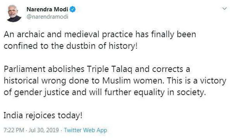 மேலும், பிரதமர் மோடி தனது ட்வீட்டில் ‘‘ஏற்றுக் கொள்ள முடியாத ஆதி கால செயல்கள் குப்பைத் தொட்டியில் வீசப்பட்டுள்ளது. இஸ்லாமிய பெண்களுக்கு நிகழ்ந்த அநீதி முத்தலாக் சட்டம் மூலம் சரிசெய்யப்பட்டுள்ளது.