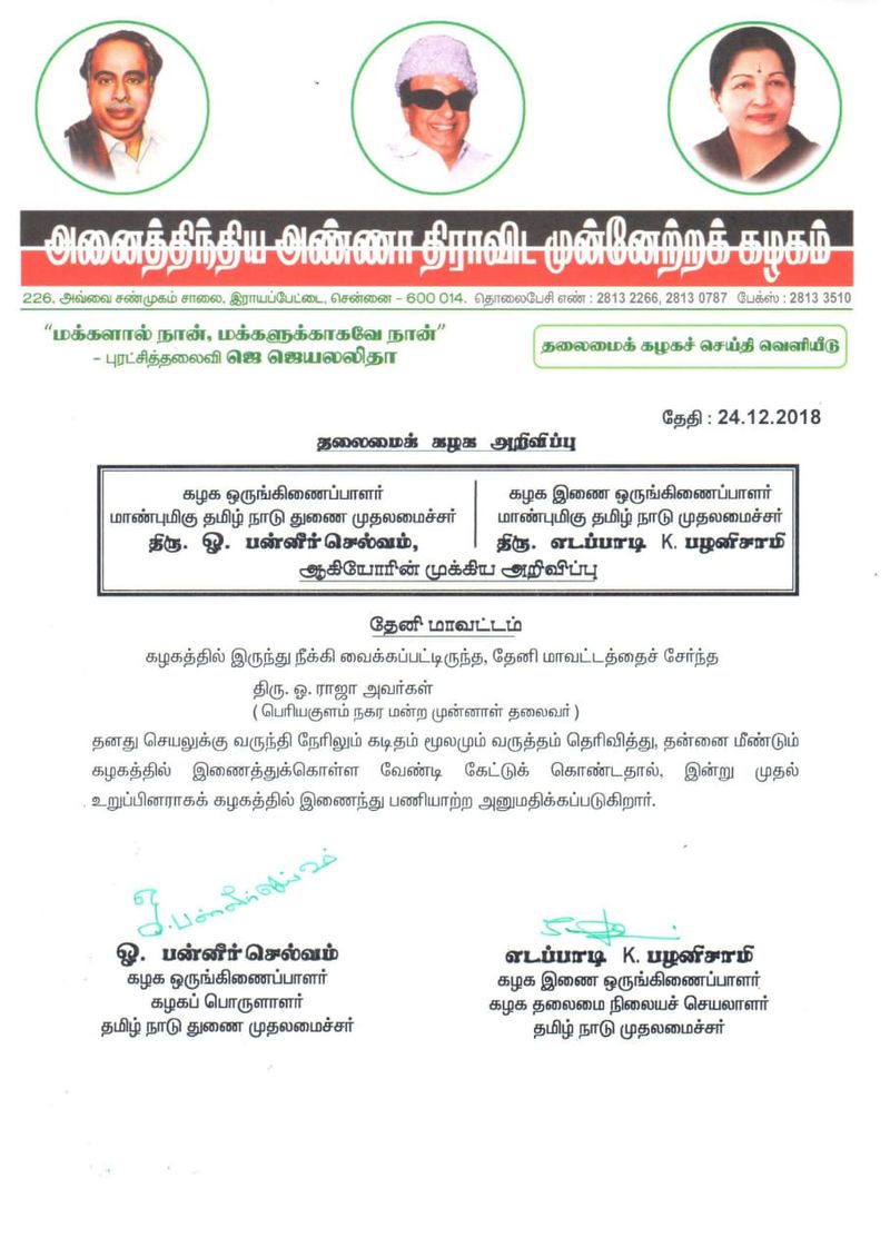அதிமுகவின் கொள்கை மற்றும் குறிக்கோளுக்கு எதிராக செயல்பட்டதுணை முதல்வர் ஒ.பன்னீர் செல்வத்தின் சகோதரர் ஓ.ராஜா அதிமுகவின் அடிப்படை உறுப்பினர் பொறுப்பிலிருந்து நீக்கப்படுவதாக ஓ.பிஎஸும் - எடப்படியும் கூட்டாக ஒர் அறிக்கையை கடந்த 19ம் தேதி அறிவித்து இருந்தனர்.