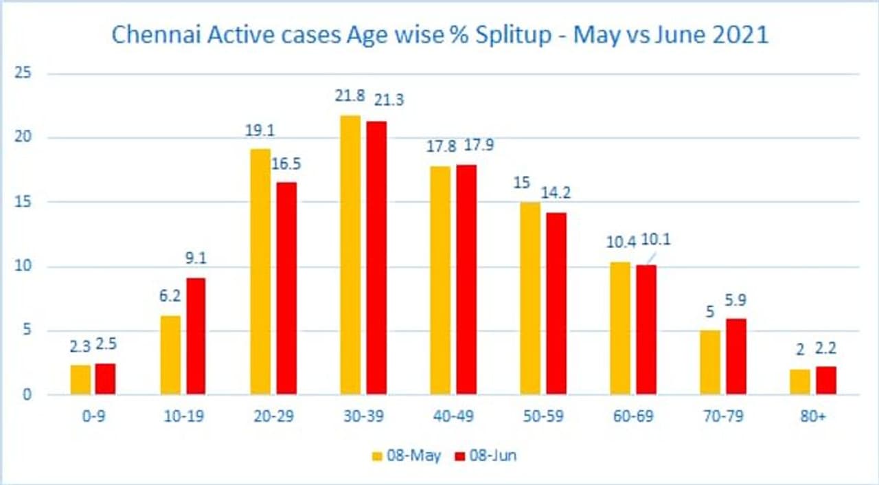 அதேபோல், 0-9 வயதினர் பொருத்தவரையில் மே மாதத்தில் 2.3% ஆக இருந்த பாதிப்பு ஜூன் மாதத்தில் 2.5% ஆகவும், 40 முதல் 49 வயதுடையவர்கள் மே மாதத்தில் 17.8% ஆக இருந்த பாதிப்பு ஜூன் மாதத்தில் 17.9% ஆகவும், 70 முதல் 79 வயதுடையவர்கள் மே மாதத்தில் 5% ஆக இருந்த பாதிப்பு ஜூன் மாதத்தில் 5.9% ஆகவும், 80 வயதிற்கு மேற்பட்டவர்கள் கடந்த மாதம் 2% ஆக இருந்த பாதிப்பு தற்போது 2.2% ஆக உயர்ந்துள்ளது. மேலும், 20 முதல் 29 வரை உள்ள வயதினர் மே மாதத்தில் 19.1% ஆக இருந்த பாதிப்பு தற்போது 16.5% ஆகவும், 30 முதல் 39 வயதுடையவர்கள் கடந்த மாதம் 21.8% ஆக இருந்த பாதிப்பு தற்போது 21.3% ஆக உள்ளது.