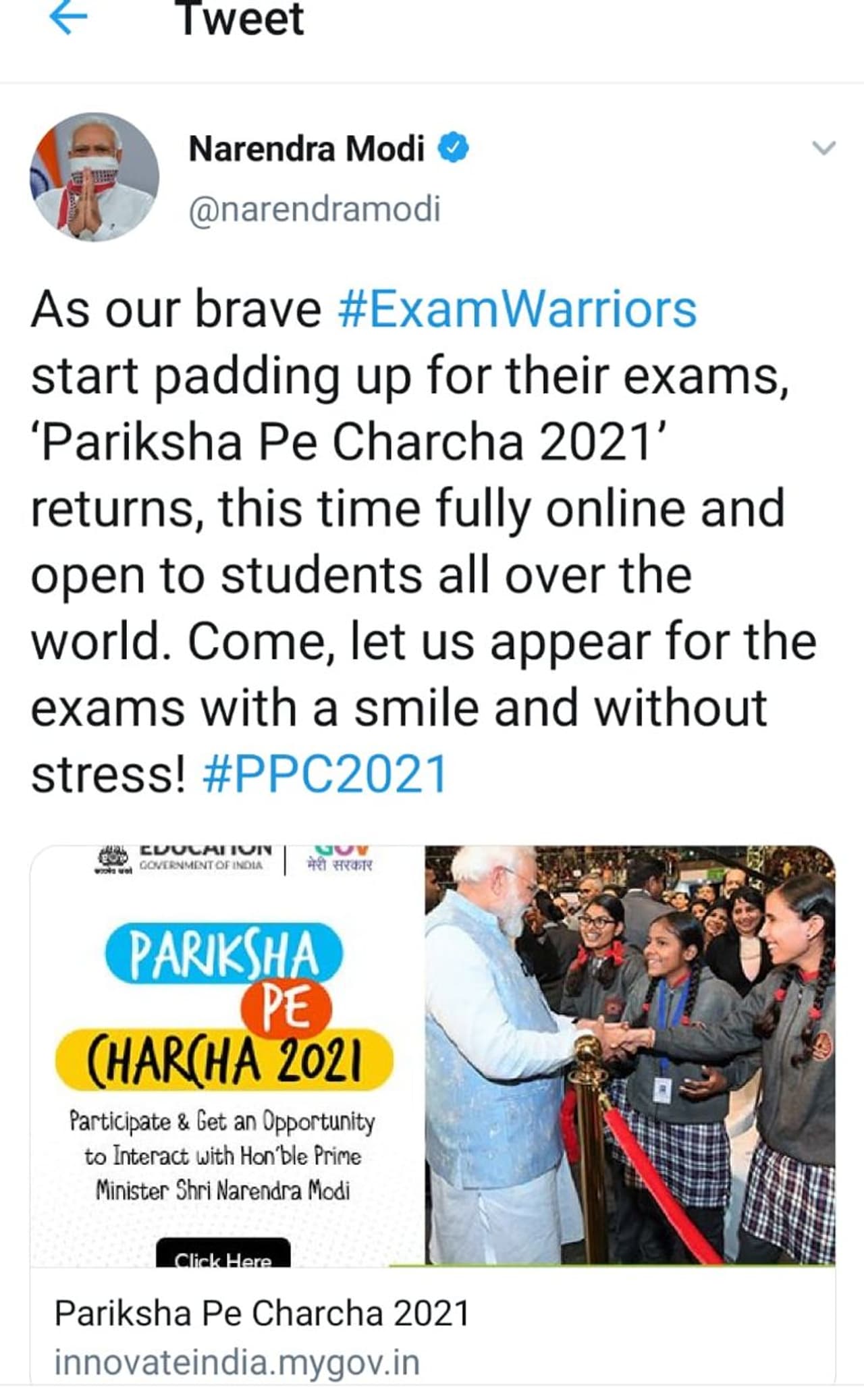 நாடு முழுவதும் 10 மற்றும் 12ஆம் வகுப்பு மாணவர்கள் பொதுத்தேர்வு சந்திக்க உள்ள நிலையில், அவர்களுக்கு தன்னம்பிக்கை ஊட்டவும், தேர்வு பயத்திலிருந்து அவர்கள் வெளிகொணரும் வகையிலும் பாரத பிரதமர் மோடி ‘பரிக்ஷா பெ சார்ச்சா 2021 என்ற நிகழ்ச்சியின் மூலம் மாணவர்களுடன் கலந்துரையாடவுள்ளார். அதற்காக மாணவர்கள் மற்றும் பெற்றோர்களின் தேர்வு செய்வதற்கான நடைமுறை தற்போது தொடங்கியுள்ளது.‘பரிக்ஷா பெ சார்ச்சா என்ற பெயரில் 2018-ஆம் ஆண்டில் இருந்து மாணவர்கள், ஆசிரியர்கள், பெற்றோர்களுடன் பிரதமர் மோடி கலந்துரையாடி வருகிறார். இது நான்காவது ஆண்டாக நடைபெற உள்ளது. பொதுத்தேர்வு எழுதும் மாணவர்களை ஊக்கப்படுத்தும் வகையில் பிரதமர் மோடி ஆண்டுதோறும் அவர்களுடன் உரையாடி வருகிறார், ஒவ்வொரு மாநிலங்களிலும் 10 ஆம் வகுப்பு மற்றும் 12 ஆம் வகுப்பு மாணவர்களுக்கு பொதுத் தேர்வுகள் நடத்தப்படுகின்றன.