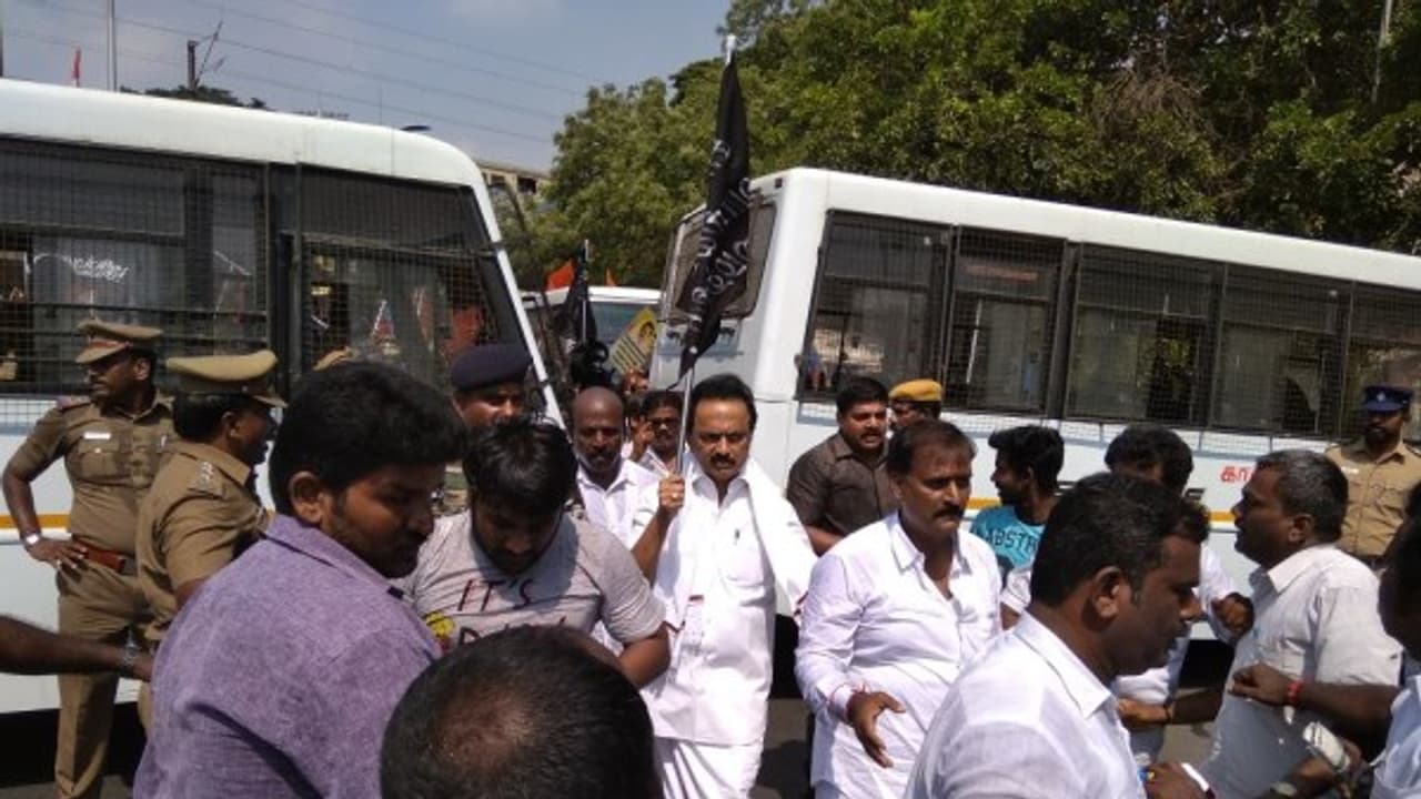 சென்னை மெரினாவில் சாலை மறியலில் ஈடுபட்ட திமுக செயல் தலைவர் ஸ்டாலின் குண்டுக்கட்டாக கைது செய்யப்பட்டுள்ளார். தமிழ்நாடு காங்கிரஸ் கமிட்டி தலைவர் திருநாவுக்கரசர், விடுதலை சிறுத்தைகள் கட்சி தலைவர் திருமாவளவன் உள்ளிட்டோரும் கைது செய்யப்பட்டனர்.