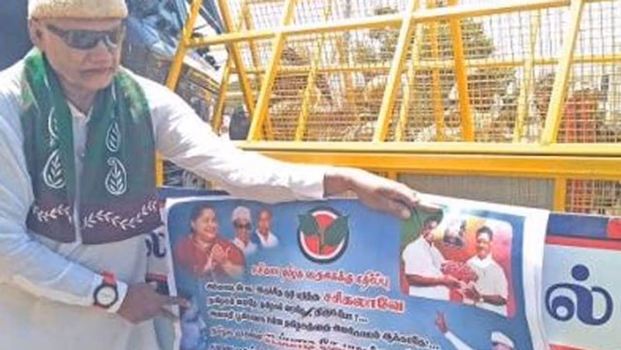அதிமுக வெற்றிக்காக 3 விரல்களை வெட்டிக்கொண்டு பிரபலமான விரல்வெட்டி ஏட்டு ரத்தினம் சசிகலா வருகைக்கு எதிர்ப்பு தெரிவித்து சுவரொட்டியுடன் சேலத்தில் பரபரப்பை ஏற்படுத்தினார்.