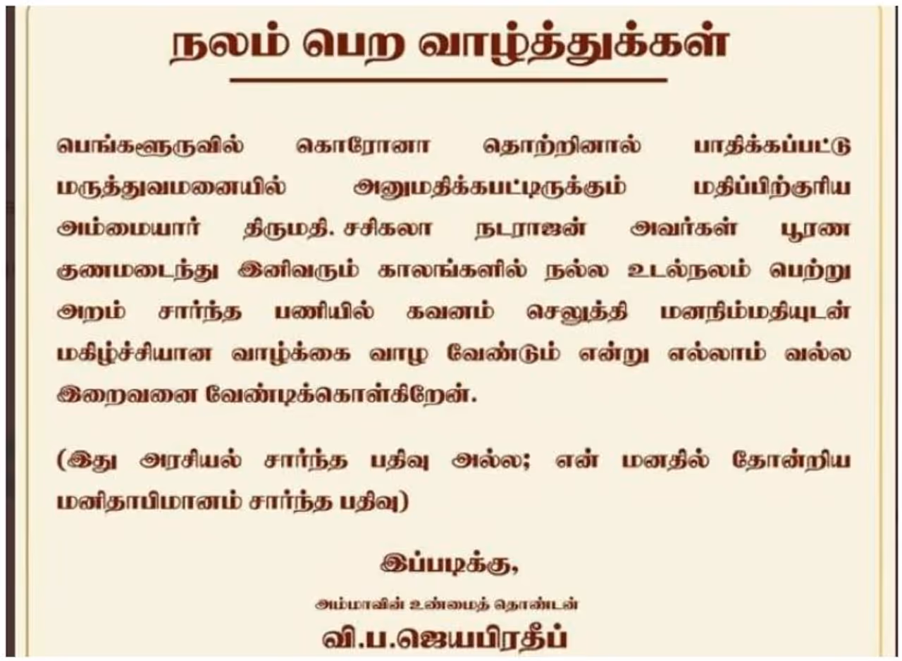 சசிகலாவுக்கு எதிராக தர்மயுத்தம் நடத்திக்கொண்டே, தன்னுடன் போராட்டத்தில் ஈடுபட்டவர்களுக்கே தெரியாமல், டி.டி.வி. தினகரனை ஓ.பி.எஸ் சந்தித்து பேசியதை அவரே போட்டு உடைத்தார். சசிகலாவை மீண்டும் அதிமுகவில் சேர்க்க 100 சதவிகிதம் வாயிப்பில்லை என்று முதல்வர் சொல்லி வரும் நிலையில், ஓ.பி.எஸ் இதுகுறித்து வாய் திறக்கவில்லை. அவரது மகன் ஜெயபிரதீப், ’’பெங்களூருவில் கொரோனா தொற்றால் பாதிக்கப்பட்டு மருத்துவமனையில் அனுமதிக்கப்பட்டிருக்கும் அம்மையார் சசிகலா நடராஜன் அவர்கள் பூரண குணமடைந்து இனிவரும் காலங்களில் நல்ல உடல் நலம் பெற்று, அறம் சார்ந்த பணியில் கவனம் செலுத்தி மன நிம்மதியுடன் மகிழ்ச்சியான வாழ்க்கை வாழ வேண்டும் என்று எல்லாம் வல்ல இறைவனை வேண்டிக்கொள்கிறேன்’ என்று கூறியிருந்தார். இது சர்ச்சை ஆனதும், மனிதாபிமான அடிப்படையில் வாழ்த்து தெரிவித்தேன் என விளக்கம் அளித்தார். இந்நிலையில், அதேநேரத்தில் ஓபிஎஸ் மகன் ஜெயபிரதீப், சசிகலா நலம்பெற வேண்டும் என தமது ஃபேஸ்புக் பக்கத்தில் பதிவிட்டார். இது மிகப் பெரும் சர்ச்சையானது.