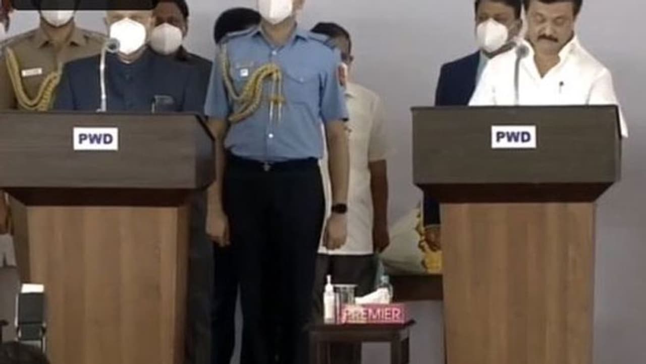 அதில் திமுக தலைவர் ஸ்டாலின் முதலமைச்சராக பதவியேற்றுக்கொண்டார், ஆளுநர் பன்வாரிலால் புரோஹித் ஸ்டாலினுக்கு பதவிப் பிரமாணம் செய்து வைத்தார். அப்போது அளுநர் பன்வாரிலால் புரோகித் ஸ்டாலினுக்கு பூங்கொத்து கொடுத்து வரவேற்றார். அப்போது ஸ்டாலின் முத்துவேல் கருணாநிதி ஸ்டாலின் ஆகிய நான் எனக்கூறி பதவி ஏற்றுக் கொண்டார். ஸ்டாலின் எதிரில் அமர்ந்திருந்த அவரது மனைவி துர்கா ஸ்டாலின் ஆனந்த கண்ணீர் வடித்தார்.