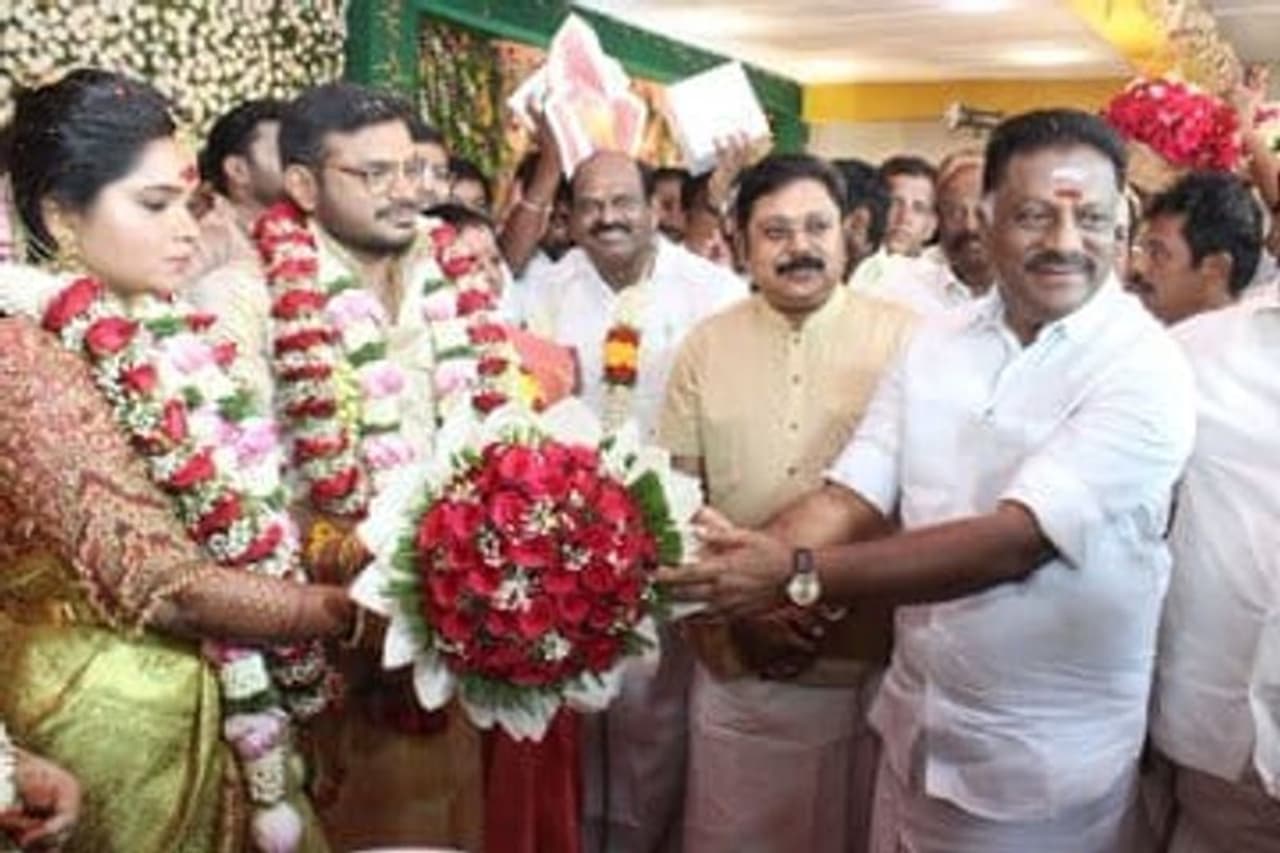 தஞ்சாவூரில் ஓபிஎஸ் ஆதரவாளரும் ஒரத்தநாடு சட்டமன்ற உறுப்பினர் வைத்திலிங்கம் மகன் இல்ல திருமணத்தை முன்னாள் முதல்-அமைச்சர் ஓ.பன்னீர்செல்வம் மற்றும் அமமுக பொதுச்செயலாளர் டிடிவி தினகரன் இருவரும் இணைந்து நடத்தி வைத்தனர். இதனை தொடர்ந்து மணமக்களை வாழ்த்தி பேசிய டிடிவி தினகரன், 6 ஆண்டுகளுக்கு பிறகு அதிமுக நிர்வாகிகள் ஒரே மேடையில் சந்திப்பது மகிழ்ச்சி. இன்று திருமணம் மற்றும் இணைப்பு விழா மகிழ்ச்சி என இரட்டிப்பு மகிழ்ச்சியாக உள்ளது. பழைய நண்பர்களை சந்திப்பது மகிழ்ச்சி. இதற்காக வைத்திலிங்கத்திற்கு நன்றி தெரிவித்துக் கொள்கிறேன். அமுமுக - அதிமுகவுடன் இணைந்து செயல்பட தொடங்கிவிட்டது. இந்த இணைப்பு துரோகிகளுக்கு பாடம் கற்பித்து, திமுகவை அகற்றி, எந்த மனமாற்றத்திற்கும் இடம் கொடுக்காமல் அனைவரும் இணைந்து செயல்படுவோம் என அவர் தெரிவித்தார்.