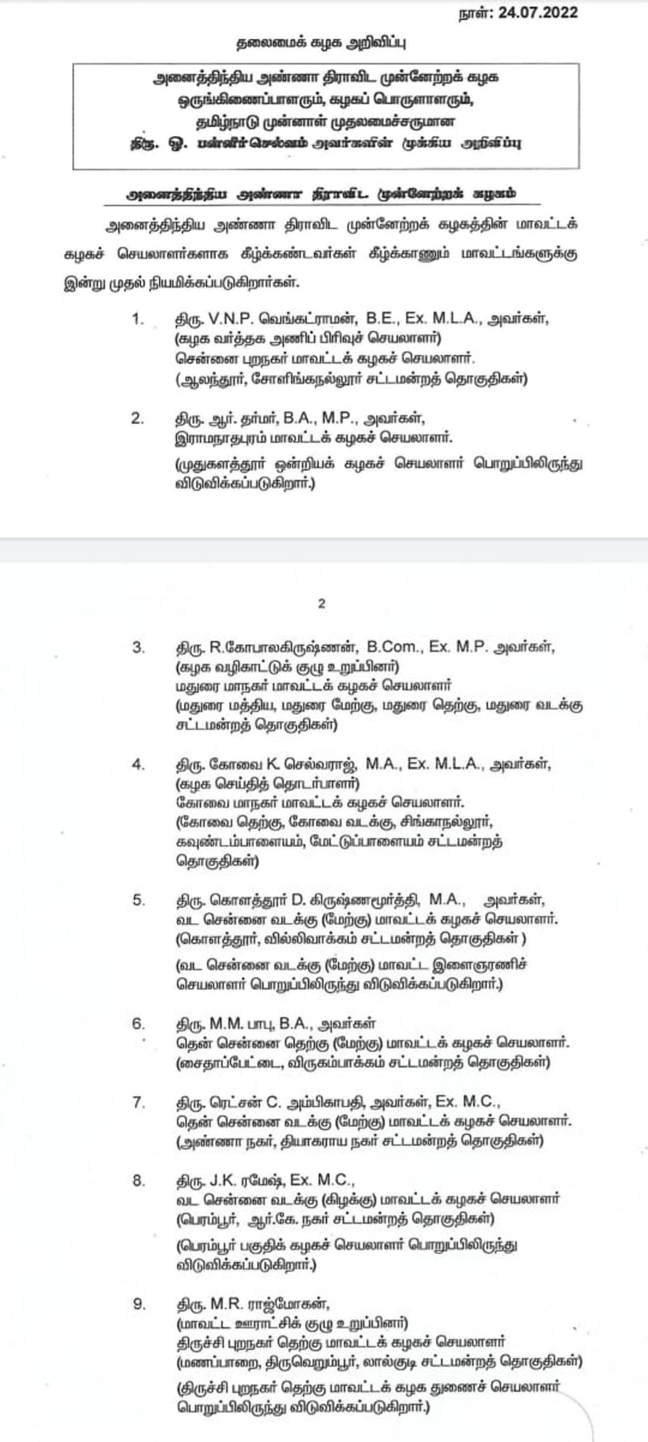 அனைத்திந்திய அண்ணா திராவிட முன்னேற்றக் கழக ஒருங்கிணைப்பாளரும், கழகப் பொருளாளரும் தமிழ்நாடு முன்னாள் முதலமைச்சருமான ஓ. பன்னீர்செல்வம் அவர்களின் முக்கிய அறிவிப்பு, அனைத்திந்திய அண்ணா திராவிட முன்னேற்றக் கழகத்தின் மாவட்டக் கழகச் செயலாளர்களாக கீழ்க்கண்டவர்கள் கீழ்க்காணும் மாவட்டங்களுக்கு இன்று முதல் நியமிக்கப்படுகிறார்கள்.