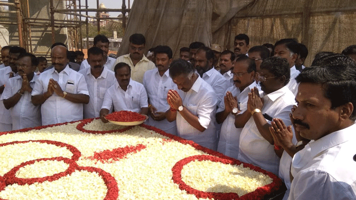 மறைந்த முதல்வர் ஜெயலலிதா மற்றும் எம்.ஜி.ஆர். நினைவிடத்தில் துணை முதல்வர் பன்னீர்செல்வம், அவரது மகன் ரவீந்திரநாத் எம்.பி. மலர்தூவி மரியாதை செலுத்தினர். அவருடன் அமைச்சர் ஆர்.பி. உதயகுமார் மற்றும் தேனி மாவட்ட அதிமுக நிர்வாகிகளும் கலந்துகொண்டனர்.