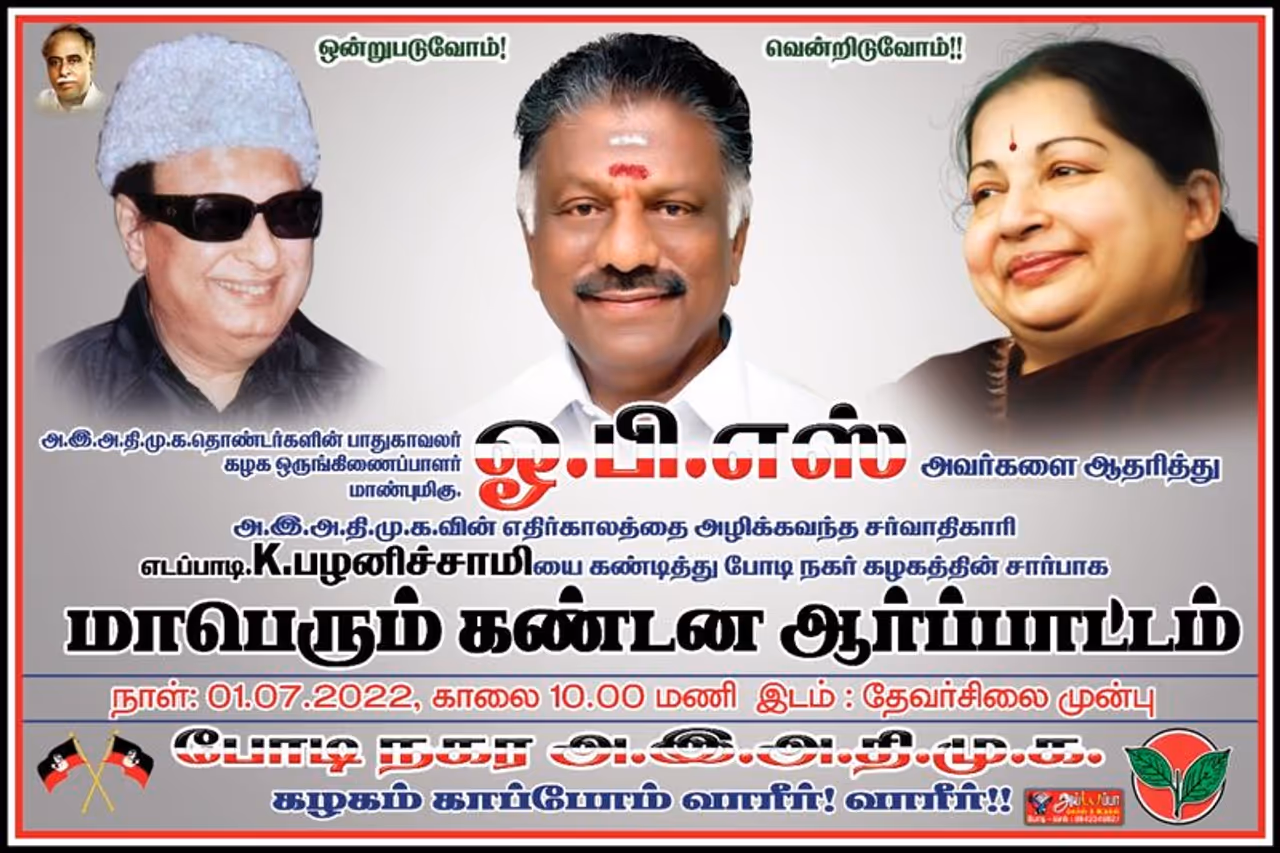 இந்த போராட்டத்தில் கழகத்தைக் காட்டி கொடுத்த எட்டப்பன் எடப்பாடி ஒழிக, மூணு சீட்டு முனுசாமி ஒழிக என்றும் ஓ.பன்னீர்செல்வம் ஒற்றை தலைமையாக வர வேண்டும், என்பது உள்ளிட்ட பல்வேறு கோஷங்களை வலியுறுத்தி போடி நகர அதிமுக சார்பாக நகரச் செயலாளர் பழனி ராஜன் தலைமையில் தேவர் சிலை முன்பாக ஆர்பாட்டம் நடைபெற்றது. இந்த போராட்டத்தில் 100க்கும் குறைவான மக்களே கலந்து கொண்டனர். அதுவும் 7 நிமிடங்கள் மட்டுமே போராட்டம் நடைபெற்றது. ஓபிஎஸ்-ன் சொந்த தொகுதியான போடியில், பெரும்பாலும் போடியில் உள்ள அலுவலகத்தில் தான் ஓபிஎஸ் இருப்பார். இந்த நிலையில் இரண்டு லட்சம் மக்கள் தொகை கொண்ட போடி நகராட்சியில் அதிமுக நடத்தும் போராட்டத்திற்கு 110 பேர் மட்டுமே வந்துள்ளது. குறிப்பாக பெண்கள் 14 பேர் மட்டுமே வந்து போராட்டத்தில் கலந்து கொண்டனர் எனவே இது ஓ.பி.எஸ்.க்கு மிகப்பெரிய பின்னடைவாகவே கருதப்படுகிறது.