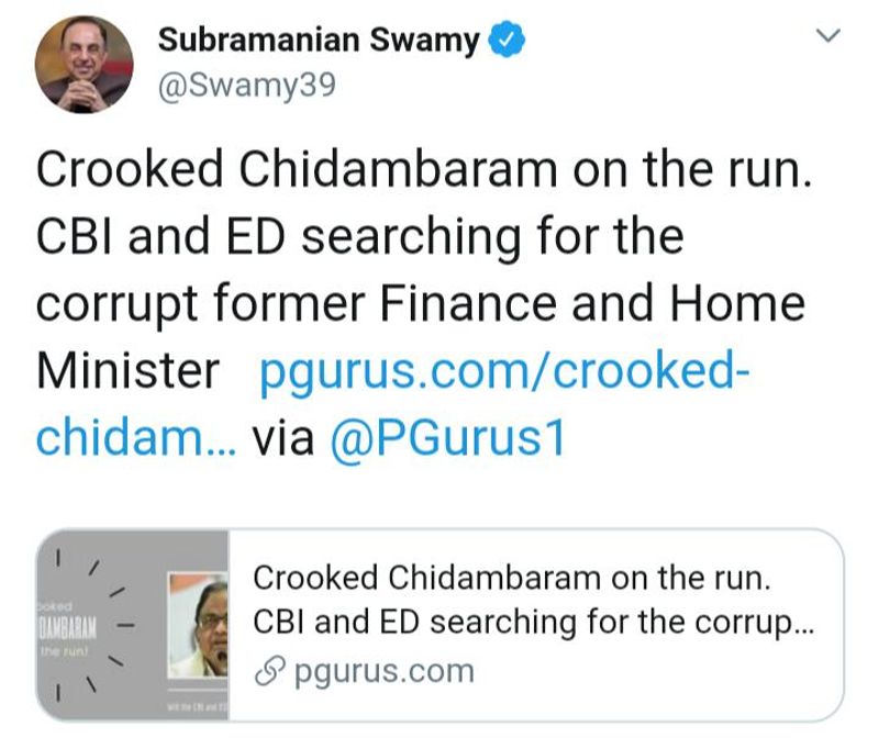 இந்நிலையில் பாஜக எம்.பி. சுப்ரமணியன்சுவாமி தனது டுவீட்டரில் "நேர்மையற்ற சிதம்பரம் தலைமறைவாகி உள்ளார். முன்னாள் மத்திய அமைச்சர் மற்றும் உள்துறை அமைச்சராக இருந்தவரை சிபிஐ மற்றும் அமலாக்கத்துறை வலைவிரித்து தேடி வருகின்றன" என குறிப்பிட்டுள்ளார். இதனை சுமார் ஒன்றரை லட்சம் பேர் லைக் செய்துள்ளனர்.
