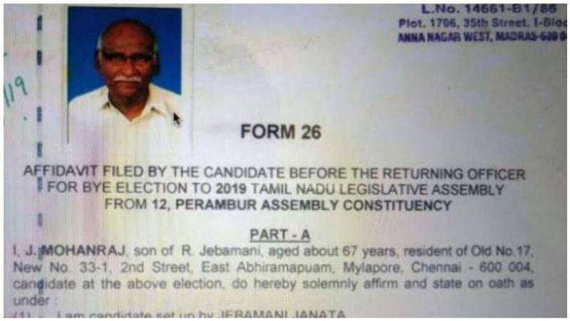தமிழகத்தில் கடந்த மார்ச் 19ஆம் தேதி தொடங்கி மார்ச் 26ஆம் தேதி முடிய வேட்பு மனு தாக்கல் நிறைவடைந்தது. வேட்பு மனு தாக்கலில் வேட்பாளர்கள் தங்களது வங்கிக் கணக்கு விவரங்களையும் சேர்த்து மனுவைச் சமர்ப்பிக்க வேண்டும். இந்த நிலையில் பெரம்பூர் தொகுதியில் ஜே.மோகன்ராஜ் என்ற வேட்பாளர் தான் ‘ஜெபமணி ஜனதா’ என்ற கட்சியின் சார்பில் போட்டியிடுவதாகவும் ஒரு லட்சத்து 76 ஆயிரம் கோடி ரூபாய் ரொக்கம் இருப்பதாகவும் வேட்பு மனுவுடன் இணைத்துத் தாக்கல் செய்யும் படிவம் 26இல் குறிப்பிட்டுள்ளார். அதாவது, தன் மனைவியிடம் 20,000 ரூபாய் ரொக்கமும், 2 லட்சத்து 50,000 ரூபாய் மதிப்புள்ள 13 சவரன் நகையும் இருப்பதாகத் தெரிவித்துள்ளார். மயிலாப்பூர் சவுத் இந்தியன் வங்கியில் 3 லட்ச ரூபாய் கடன் இருப்பதாக மோகன்ராஜ் கூறியுள்ளார்.