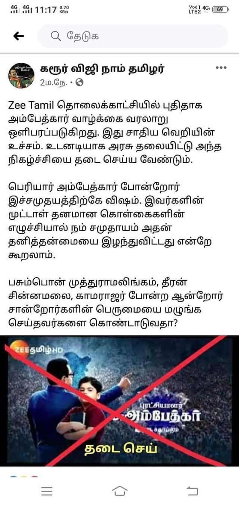 வன்னியர் சமுதாயத்தை சேர்ந்தவரான கரூர் விஜி, அம்பேத்கர் தொடர் குறித்து தனது முகநூல் பதிவில், ‘’ ஜீ தமிழ் தொலைக்காட்சியில் புதிதாக அம்பேத்கர் வாழ்க்கை வரலாறு ஒளிபரப்பப்படுகிறது. இது சாதி வெறியின் உச்சம். உடணடியாக அரசு தலையிட்டு இந்த நிகழ்ச்சியை தடை செய்ய வேண்டும். பெரியார், அம்பேத்கர் போன்றோர் இச்சமுதாயத்திற்கே விஷம். இவர்களின் முட்டாள்தனமான கொள்கைகளின் எழுச்சிஆல் ந்ம் சமுதாயம் அதன் தனித்தன்மையை இழந்து விட்டது என்றே கூறலாம். பசும்பொன் முத்துராமலிங்கம், தீரன் சின்னமலை, காமராஜர் போன்ற ஆன்றோர், சான்றொர்களின் பெருமையை மழுங்க செய்தவர்களை கொண்டாடுவதா? என எதிர்ப்புத் தெரிவித்து இருந்தார்.