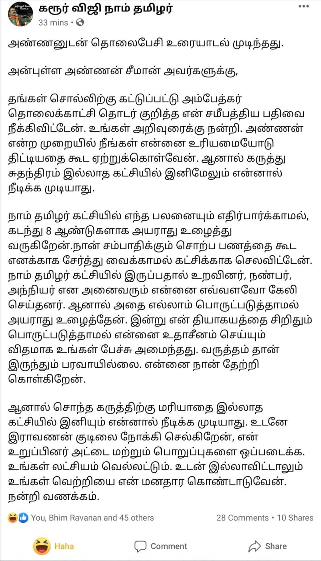இதனையடுத்து நாம் தமிழர் கட்சி ஒருங்கிணைப்பாளர் சீமான் கரூர் விஜியை தொலைபேசியில் அழைத்து கடுமையாக திட்டியதாக தெரிகிறது. அப்போது நடந்தவற்றையும் கரூர் விஜி தனது முகநூல் பக்கத்தில் எழுதியிருக்கிறார். அதில், ‘’அண்ணனுடன் தொலைபேசி உரையாடல் முடிந்தது. அன்புள்ள அண்ணன் சீமான் அவர்களுக்கு, தங்கள் சொல்லிற்கு கட்டுப்பட்டு அம்பேத்கர் தொலைக்காட்சி தொடர் குறித்த என் சமீபத்திய பதிவை நீக்கிவிட்டேன். உங்கள் அறிவுரைக்கு நன்றி. அண்ணன் என்ற முறையில் நீங்கள் என்னை உரியமையோடு திட்டியதை கூட ஏற்றுக்கொள்வேன். ஆனால் கருத்து சுதந்திரம் இல்லாத கட்சியில் இனிமேலும் என்னால் நீடிக்க முடியாது.