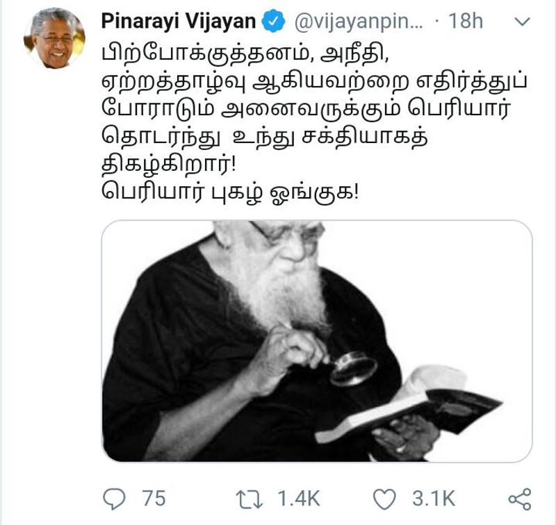 தமிழகத்தின் பல்வேறு பகுதிகளிலும் பெரியார் பிறந்தநாள் கொண்டாடப்பட்டது.. இந்நிலையில், கேரள முதலமைச்சர் பினராயி விஜயன் பெரியாரின் பிறந்தநாள் குறித்து தனது ட்விட்டர் பக்கத்தில் தமிழில் பதிவிட்டுள்ளார்.