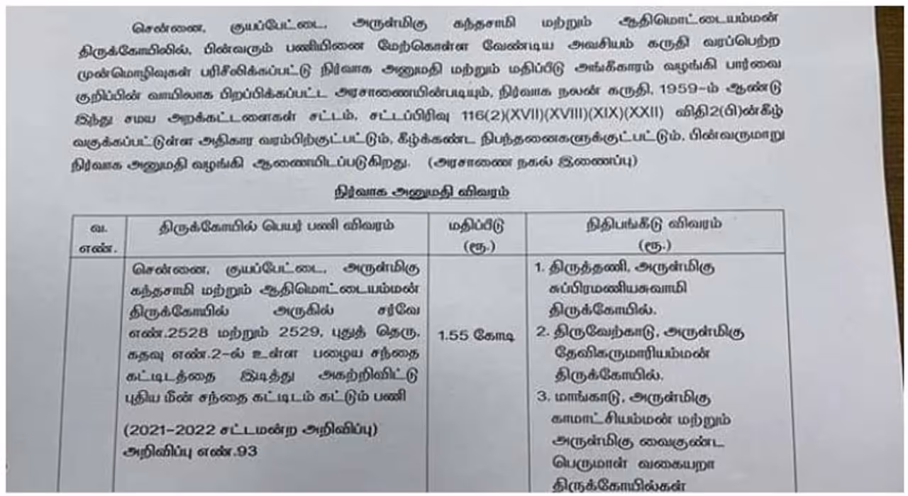 சென்னை குயப்பேட்டையில் உள்ள கந்தசாமி மற்றும் ஆதி மொட்டையம்மன் கோயில்கள் அருகே பழைய மீன் சந்தை கட்டிடத்தை இடித்து அகற்றிவிட்டு, அதற்குப் பதிலாக புதிய மீன் சந்தைக்கான கட்டிடம் கட்டப்படும் என்று தமிழக சட்டப்பேரவையில் ஏற்கெனவே அறிவிப்பு வெளியிடப்பட்டது. இந்தக் கட்டிடங்களைக் கட்டும் பணிகளுக்கு ரூ. 1.55 கோடி தேவைப்படும் என்று மதிப்பிடப்பட்டுள்ளது. இந்நிலையில் இந்த மீன் சந்தையைக் கட்டுவதற்கு தேவையான நிதியை திருத்தணி சுப்பிரமணிய சுவாமி கோயில், திருவேற்காடு தேவி கருமாரியம்மன் கோயில், மாங்காடு காமாட்சியம்மன் மற்றும் வைகுண்ட பெருமாள் கோயில் போன்ற திருக்கோயில்களிலிருந்து கடனாகப் பெற்றுக்கொள்வது என்று முடிவு செய்யப்பட்டது. இதற்கு இந்து அறநிலையத் துறை ஆணையர் குமரகுருபரன் நிர்வாக அனுமதியை வழங்கியுள்ளார்.