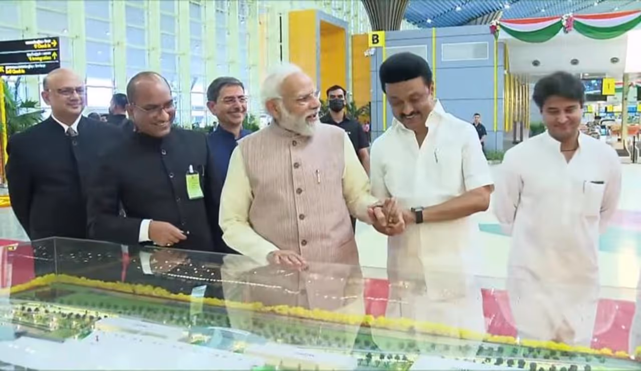பின்னர், சாலை வழியாக சர்வதேச சென்னை விமான நிலையத்திற்கு வந்தார். அவரை ஆளுநர் ஆர். என். ரவி, முதல்வர் ஸ்டாலின் உள்ளிட்ட தலைவர்கள் வரவேற்றனர். இதனைத் தொடர்ந்து, புதிய ஒருங்கிணைந்த முனையத்தை பிரதமர் மோடி பார்வையிட்டார். இதன்பிறகு, ரூ. 1, 260 கோடி மதிப்பில் 1. 36 லட்சம் சதுர மீட்டரில் கட்டப்பட்டுள்ள புதிய ஒருங்கிணைந்த முனையத்தை பிரதமர் நரேந்திர மோடி திறந்து வைத்தார்.