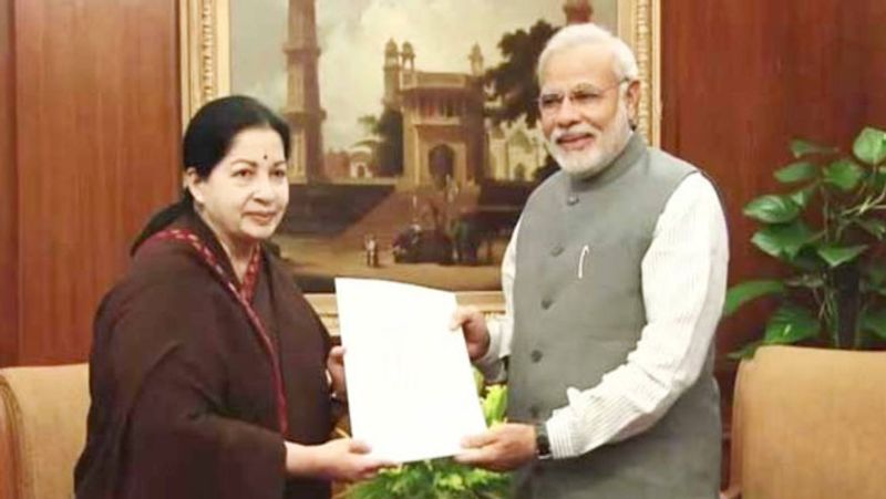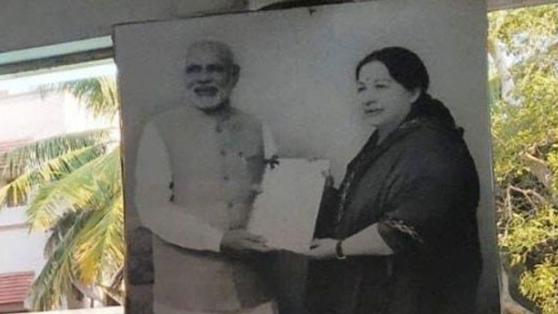 பிரதமர் நரேந்திர மோடிக்கு ஜெயலலிதா கோரிக்கை மனு தருவது போன்ற அந்தப் புகைப்படம் உள்ளது. இதேபோல வாஜ்பாயுடன் ஜெயலலிதா இருக்கும் புகைப்படமும் வைக்கப்பட்டுள்ளது. நாடாளுமன்றத் தேர்தலில் அதிமுகவுடன் இணைந்து பாஜக போட்டியிடுகிறது. பாஜகவுக்கு 5 தொகுதிகள் ஒதுக்கப்பட்டுள்ளன. கூட்டணி அமைந்த காரணத்தால் வாஜ்பாய் மற்றும் மோடியுடன் ஜெயலலிதா இருக்கும் படம் இடம்பெற்றதாகக் கூறப்படுகிறது.