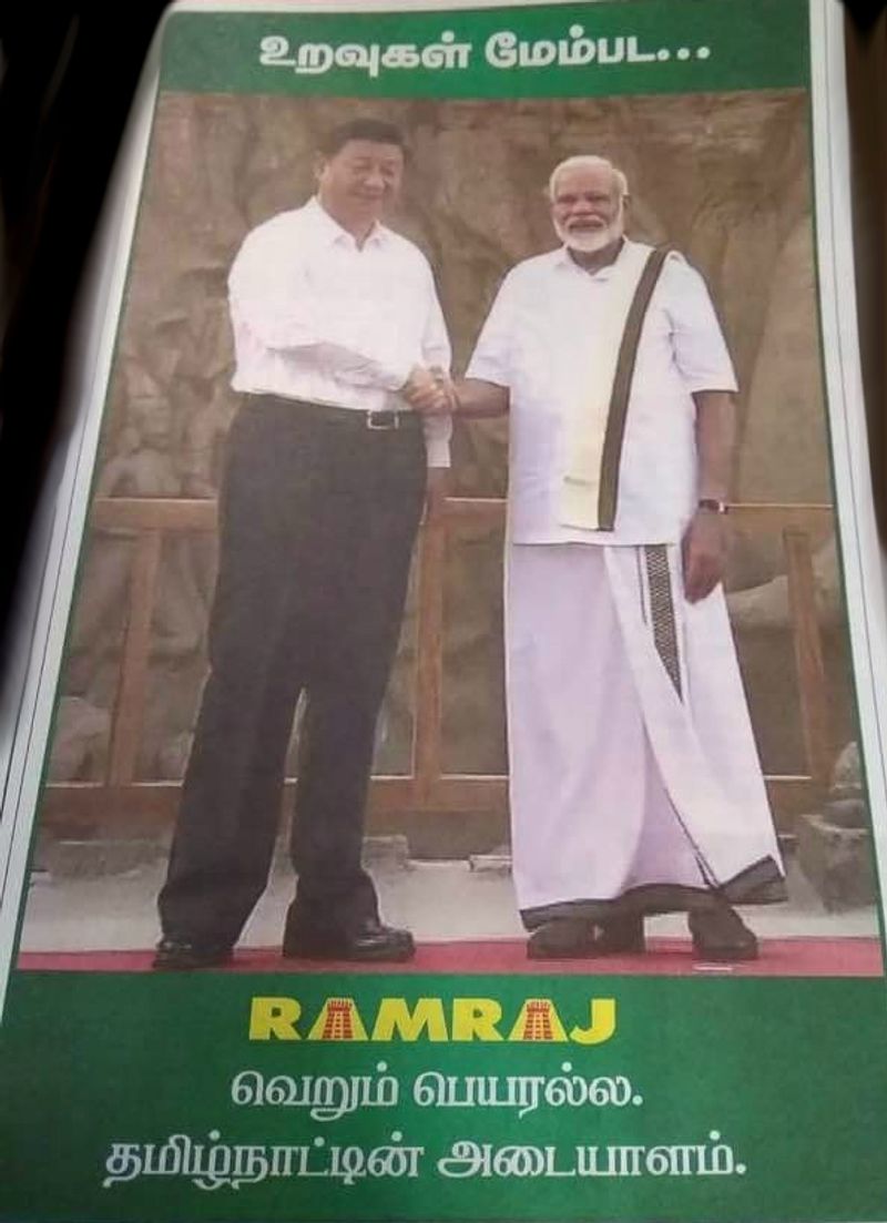 மோடி வேட்டி சட்டை அணிந்து மாமல்லபுரத்தில் அசத்தியது தமிழகம் முழுவதும் பரபரப்பாக பேசப்பட்டது. இந்நிலையில் வேட்டியுடன் மோடி சீன அதிபருடன் இருக்கும் புகைப்படத்தை வைத்து ராம்ராஜ் காட்டன் வேட்டிகள் சட்டைகள் நிறுவனம் நாளிதழில் விளம்பரம் கொடுத்துள்ளது. அந்த விளம்பரத்தில் உறவுகள் மேம்பட என சீன -இந்திய உறவுகளை குறிக்கும் வகையில் விஅபரம் வெளியிடப்பட்டுள்ளது.