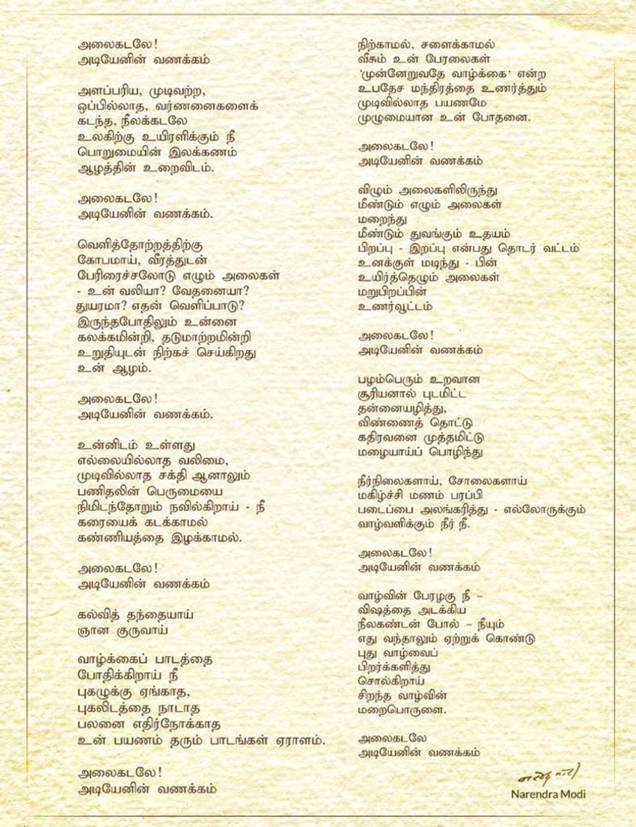 இந்தநிலையில் தற்போது அதன் தமிழாக்கத்தை பிரதமர் மோடி தனது ட்விட்டர் பக்கத்தில் பகிர்ந்துள்ளார். 'அலைக்கடலே.. அடியேனின் வணக்கம்' என்று தொடங்கும் அந்த கவிதையில் கடலின் தன்மைகளை பிரதமர் கூறியிருக்கிறார். கடலுடன் மனித வாழ்வின் செயல்பாடுகளை ஒப்பிட்டு எழுதியுள்ளார். பிரதமர் மோடியின் கையெழுத்துடன் அவரது அதிகாரப்பூர்வ ட்விட்டர் பக்கத்தில் இந்த கவிதை வெளியிடப்பட்டுள்ளது. அதை பலர் பகிர்ந்து வருகின்றனர்.