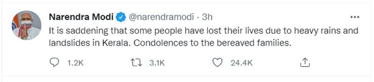 இந் நிலையில், கேரளாவில் கனமழை மற்றும் நிலச்சரிவில் சிக்கி பலர் பலியானது வேதனை அளிப்பதாக பிரதமர் மோடி உருக்கமுடன் கூறி உள்ளார். இது குறித்து அவர் வெளியிட்டு உள்ள டுவிட்டர் பதிவில் தெரிவித்து உள்ளதாவது: