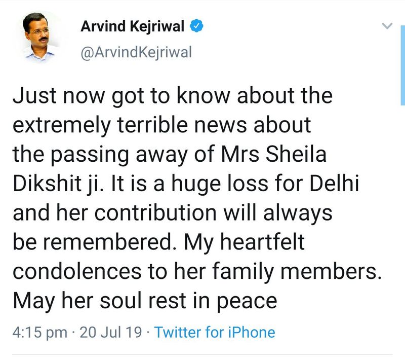 அவரது மறைவால் துயருற்றிருக்கும் குடும்பத்தாருக்கும், டெல்லி மக்களுக்கும் எனது இரங்கல்களை தெரிவித்துக் கொள்கிறேன்’ என்று குறிப்பிட்டுள்ளார்.