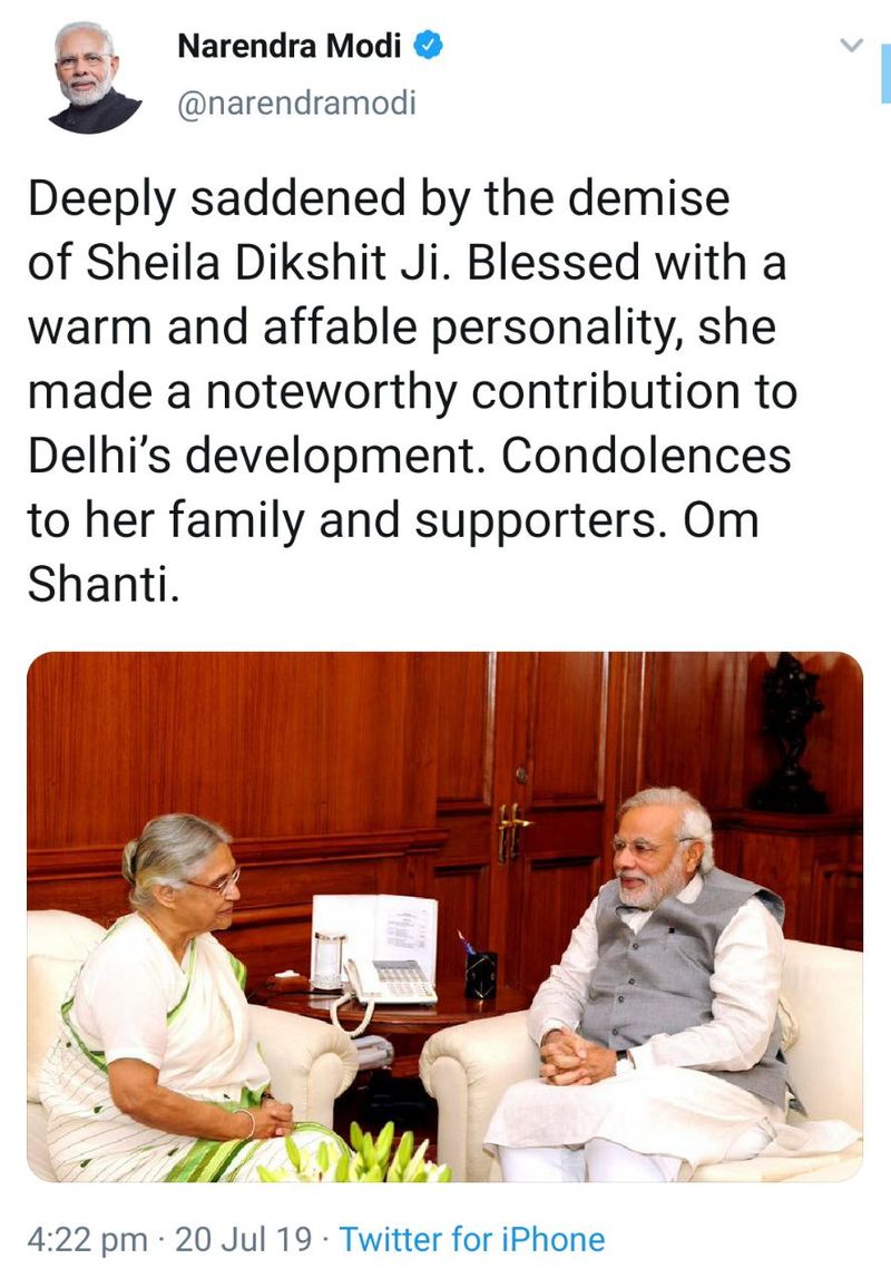 டெல்லியின் வளர்ச்சிக்கு குறிப்பிடத்தக்க வகையில் பங்காற்றியதாக ஷீலா தீட்சித்திற்கு பிரதமர் மோடி புகழாரம் சூட்டியுள்ளார். அவரது குடும்பத்தினருக்கும் ஆதரவாளர்களுக்கும் ஆழ்ந்த இரங்கலை தெரிவித்துக்கொள்கிறேன். ஓம் சாந்தி என தனது டுவிட்டர் பக்கத்தில் மோடி பதிவிட்டுள்ளார்.