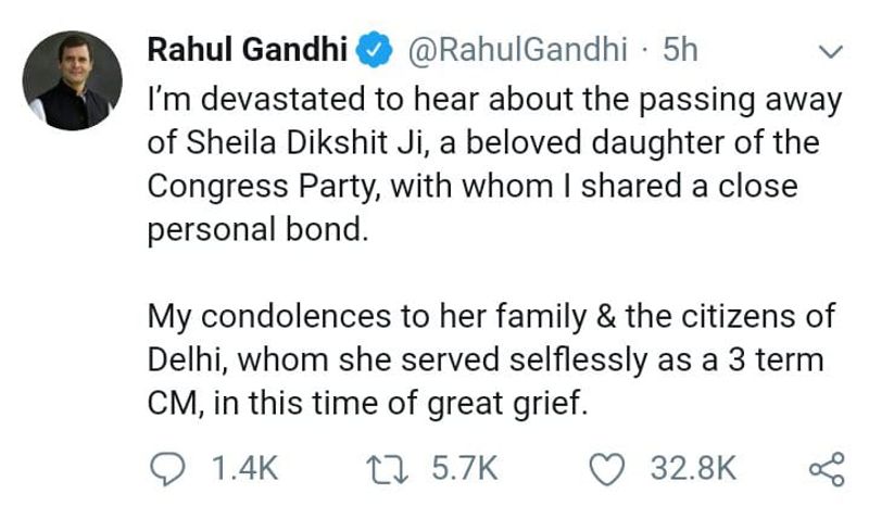 காங்கிரஸ் தலைவர் ராகுல் காந்தி தனது டுவிட்டர் பக்கத்தில் வெளியிட்டுள்ள பதிவில் 'காங்கிரஸ் கட்சியின் அன்புக்குரிய மகளான ஷீலா தீட்சித் மறைவு செய்தியை அறிந்து அதிர்ச்சி அடைந்துள்ளேன். தனிப்பட்ட முறையில் என்னுடன் நெருக்கமான நல்லுறவுகளை பேணிவந்த அவரது மறைவு மிகப்பெரிய பேரிழப்பாகும்.