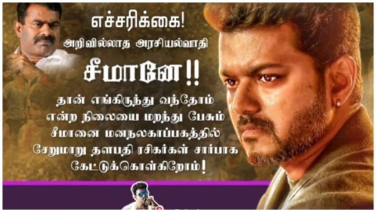 ‘எங்கள் தளபதியை பற்றி பேச என்ன தகுதி இருக்கு’, ‘அரசியலில் செல்லாக்காசு சீமான்’, அரசியல் அறிவில்லாத சீமான் உள்ளிட்ட வசனங்கள் போட்டு போஸ்டர்கள் அடித்து ஒட்டியுள்ளனர்.