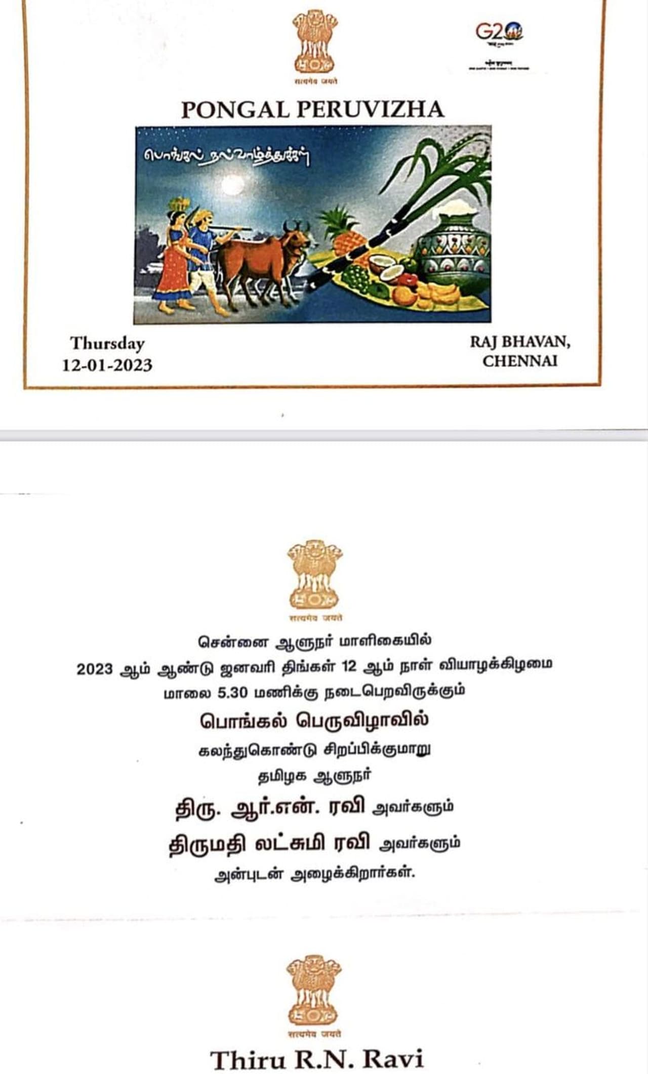 கடந்த ஆண்டு நடைபெற்ற சித்திரை திருநாள் விழாவிற்கு தமிழ்நாடு ஆளுநர் ஆர் என் ரவி என அச்சடிக்கப்பட்டிருந்தது. தற்போது அதாவது நாளை மறுதினம் நடைபெறவுள்ள பொங்கல் பண்டிகை அழைப்பிதழில் தமிழக ஆளுநர் என அச்சடிக்கப்பட்டு முக்கிய பிரமுகர்களுக்கு வழங்கப்பட்டுள்ளது. இந்த அழைப்பிதழுக்கு தமிழக அரசியல் கட்சிகள் கடும் கண்டனத்தை தெரிவித்துள்ளனர். மார்க்சிஸ்ட் கம்யூனிஸ்ட் கட்சி நாடாளுமன்ற உறுப்பினர் சு.வெங்கடேஷன் வெளியிட்டுள்ள டுவிட்டர் பதிவில், ஆளுநர் மாளிகையில் இருந்து சித்திரை விழாவுக்கு வந்த அழைப்பில் “தமிழ்நாடு ஆளுநர்” என்று இருந்தது. இப்பொழுது பொங்கல் விழாவுக்கு வந்துள்ள அழைப்பில் “தமிழக ஆளுநர்”என்று இருக்கிறது.
