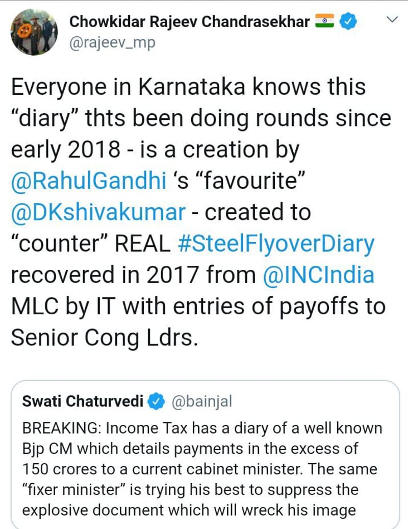 இது தொடர்பாக அவர் தனது டுவிட்டர் பக்கத்தில், ஸ்வாதி சதுர்வேதி அடிப்படை ஆதாரமற்ற குற்றச்சாட்டை தெரிவித்துள்ளதாக குறிப்பிட்டுள்ளார். இது தொடர்பாக கடந்த 2018 ஆம் ஆண்டின் தொடக்கத்தில் டைரி ஒன்று கர்நாடகாவில் வலம் வந்தது அனைவருக்கும் தெரியும் என ராஜீவ் சந்திரகேர் தெரிவித்துள்ளார்.