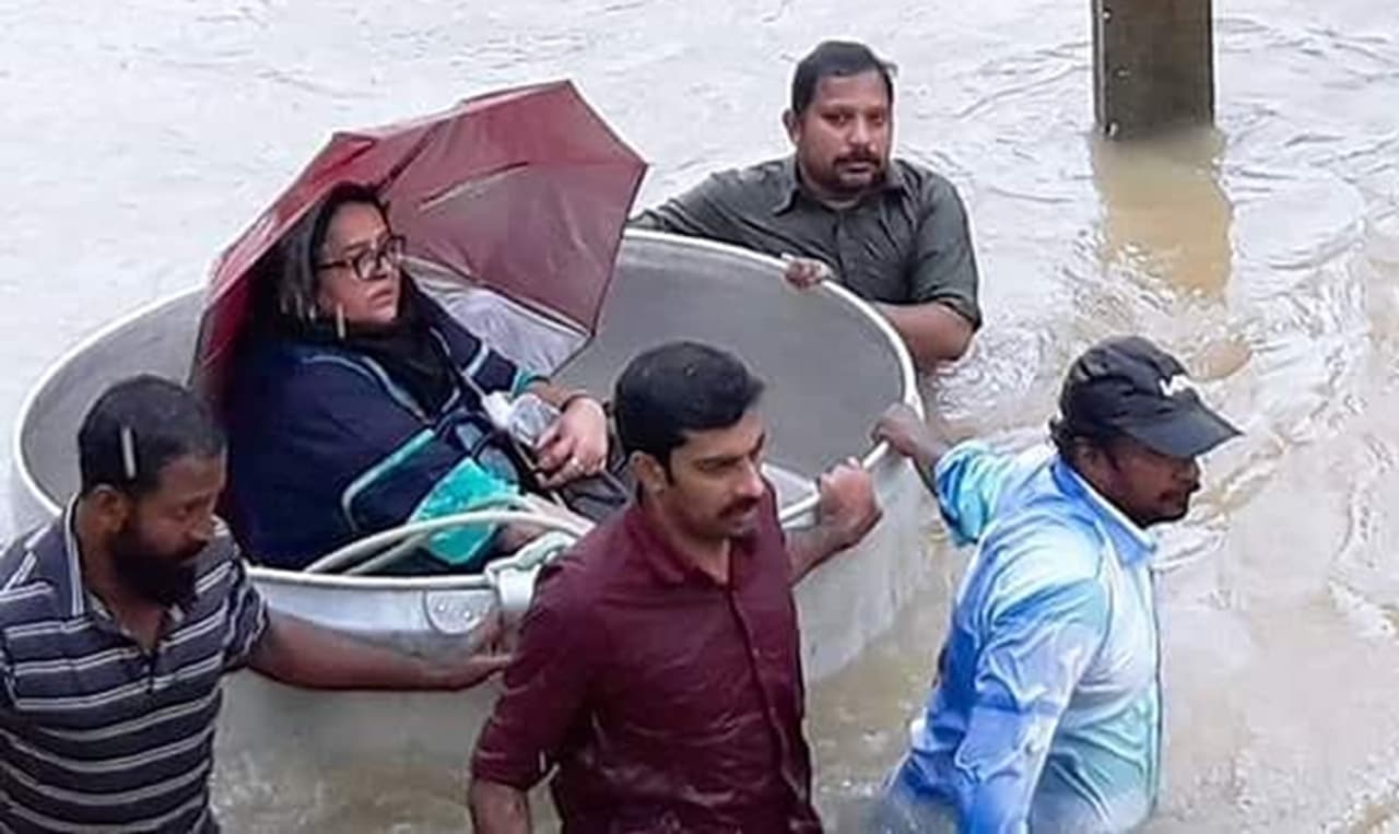 பிருத்விராஜின் பங்களாவை சுற்றி வெள்ள நீர் சூழ்ந்தது. பங்களாவுக்குள்ளும் தண்ணீர் புகுந்த நிலையில் அருகிலிருந்தோர் பங்களாவில் தங்கியிருந்த மல்லிகாவை சிறிய பரிசல் மூலம் பத்திரமாக மீட்டனர்.
