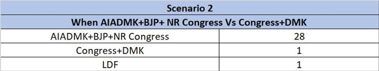 அதே வேளையில், பாஜக - அதிமுக கூட்டணியில் என்.ஆர்.காங்கிரஸும் இடம்பெற்றால், பாஜக கூட்டணி 28 தொகுதிகளை ஜெயிக்கும் என்றும் காங்கிரஸ் - திமுக கூட்டணி வெறும் ஒரு தொகுதியை மட்டுமே ஜெயிக்கும் என சர்வே முடிவுகள் தெரிவிக்கின்றன.
