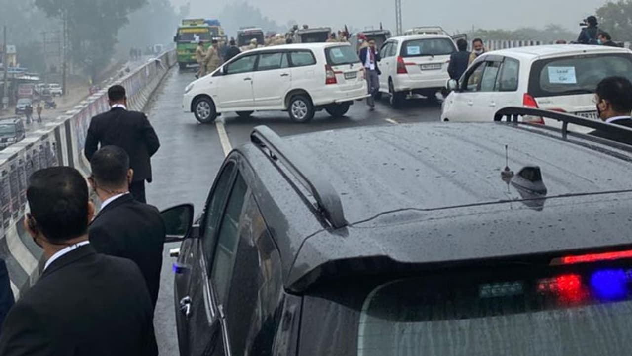 இந்த நிகழ்ச்சிக்காக நேற்று முன்தினம் பஞ்சாப் வந்த பிரதமர் மோடி,விமான நிலையத்திலிருந்து நிகழ்ச்சி நடைபெறும் இடத்திற்கு ஹெலிகாப்டர் மூலம் செல்ல இருந்த நிலையில் மோசமான வானிலை கரணமாக ஹெலிகாப்டர் பயணம் ரத்து செய்யப்பட்டு சாலை மார்க்கமாக பிரதமர் சென்றார். அப்போது, பதிண்டா என்ற இடத்தில் மேம்பாலத்தில் ஏராளமான போராட்டக்காரர்கள் சாலையை மறித்ததால் 20 நிமிடங்கள் பிரதமரின் வாகனம் நின்றது.