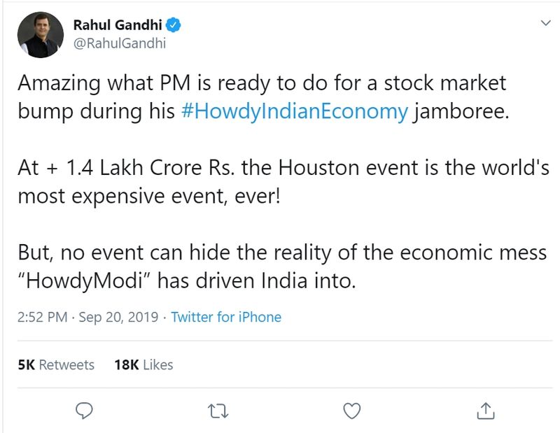 மேலும், 'உலகிலேயே மிகவும் ஆடம்பரமாக நடக்கும் ஹவுடி மோடி (Howdy Modi) நிகழ்ச்சியால், 'ஹவுதி மோடி' உருவாக்கிய பொருளாதார குழப்பம் என்ற உண்மை நிலையை மறைக்க முடியாது' எனவும் அதில் ராகுல் காந்தி பதிவிட்டுள்ளார்.