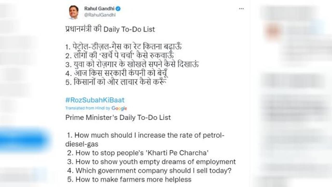 காங்கிரஸ் தலைவர் ராகுல் காந்தி இன்று வெளியிட்ட டுவிட்டர் பதிவில், "பிரதமிரன் தனசரி to-do லிஸ்ட் - பெட்ரோல், டீசல், சமையல் எரிவாயு விலையை எப்படி உயர்த்துவது, மக்கள் செலவீனங்கள் பற்றிய விவாதத்தை எப்படி நிறுத்துவது, இளைஞர்களின் வேலைவாய்ப்பு கனவை எப்படி இருட்டடிப்பு செய்வது, எந்த பொதுத்துறை நிறுவனத்தை விற்பது, விவசாயிகள் நிலையை எப்படி மேலும் மோசமாக்குவது," என குறிப்பிட்டு இருக்கிறார்.